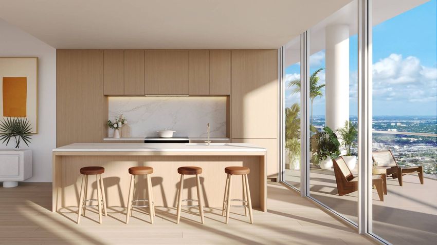 На кухнях предусмотрена мебель, изготовленная по индивидуальному заказу от Rockwell Group, столешницы и фартуки из шлифованного кварцевого камня Calacatta Gold, и кухонный остров с дубовым основанием.