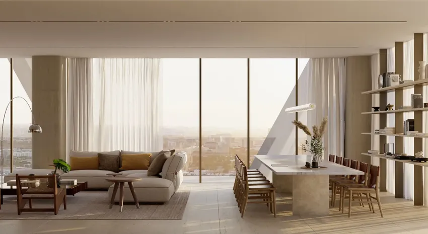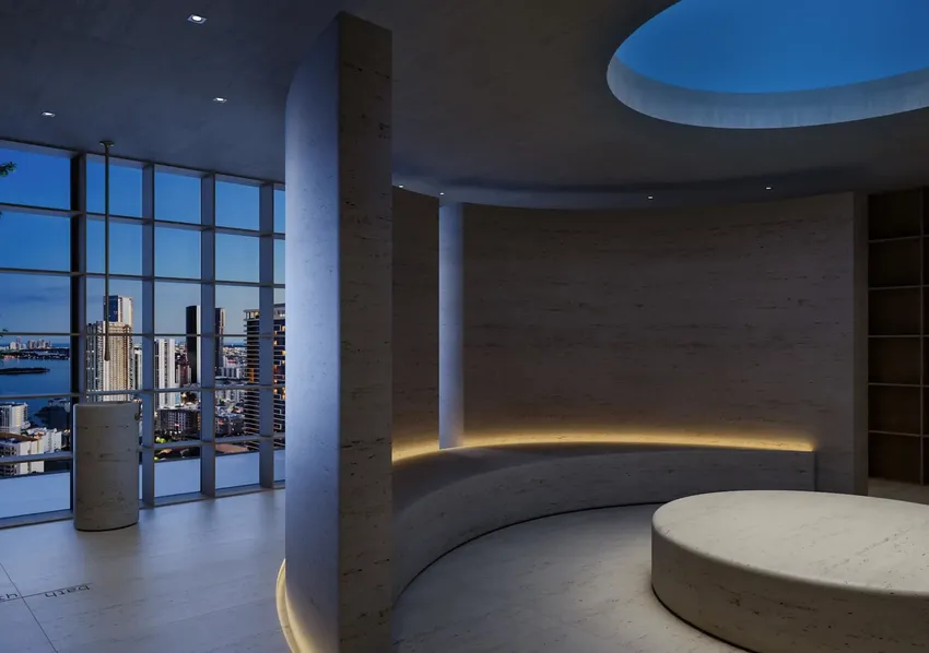 Планировки построены вокруг открытых жилых зон, где гостиная и кухня формируют единое функциональное пространство. Панорамные окна от пола до потолка усиливают естественное освещение и визуальную связь с городом и заливом. В проекте представлены планировки с балконами, а также отдельные резиденции и пентхаусы с террасами — это расширяет сценарии использования пространства и поддерживает принцип outside-in.