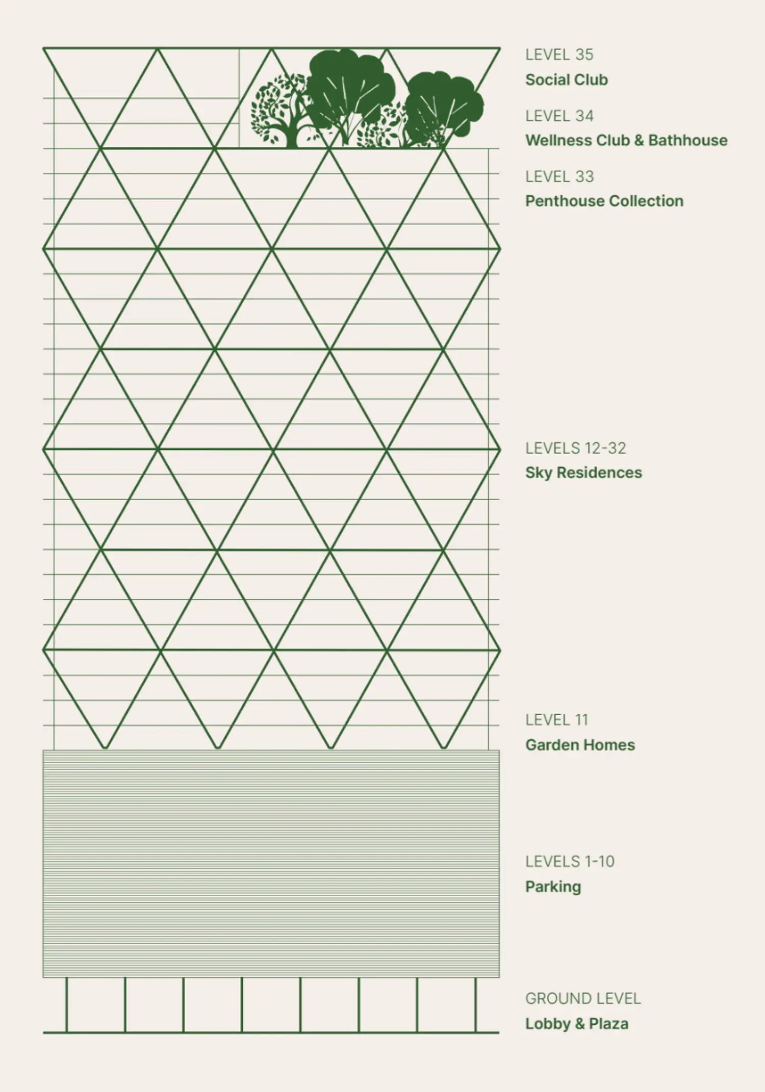 35-этажная башня формирует чёткий вертикальный силуэт и отличается характерным diagrid-фасадом — диагональной архитектурной структурой, создающей глубину, ритм и визуальную динамику.