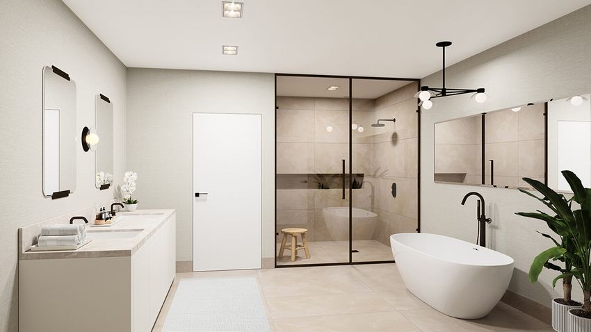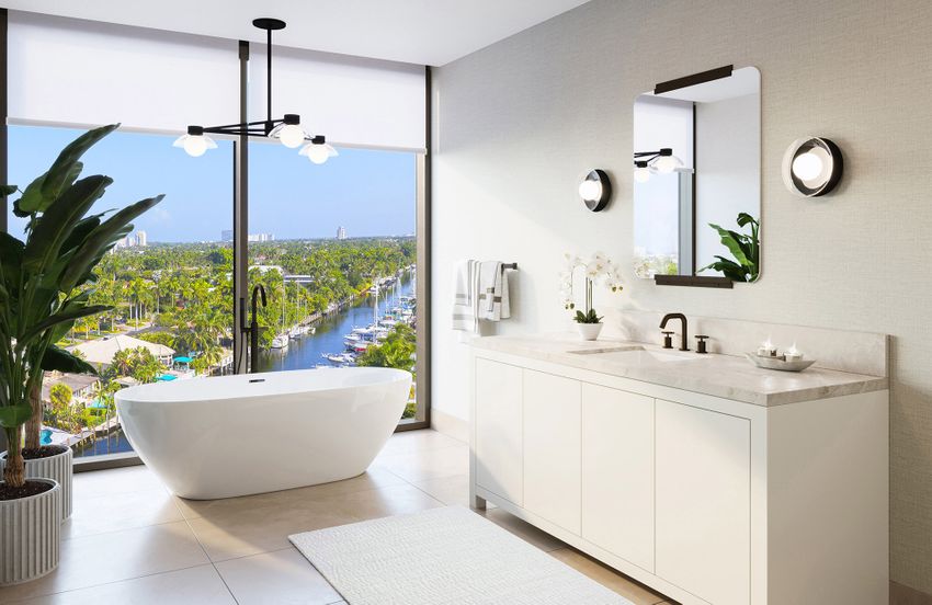 Роскошные ванные комнаты рядом с главным спальнями включают либо две отдельные ванны (в боковых резиденциях), либо двойные раковины (в центральных резиденциях). Все главные ванные комнаты располагают основной глубокой ванной и высокими безрамными душевыми кабины со стеклянными стенами. Душ оснащен системой электронного управления. Столешницы вокруг раковин сделаны из натурального кварца, а полы и стены отделаны керамогранитной плиткой крупного формата.