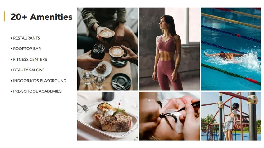 • Фитнес-центры и спортивные площадки, включая футбольные поля и корты для паддл-тенниса.