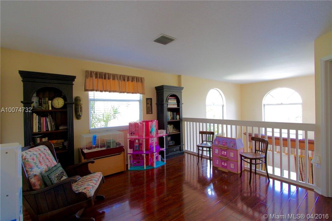 Beautifully upgraded 3 bed/2.5 bath waterfront home on quiet tree-lined street. Wood floors throughout. Kitchen has granite counters & backsplash, tall wood cabinets, stainless steel appliances. Domed, screened patio with view of private deeded waterway. Open spacious plan with loft overlooking living room and back yard. Master bedroom has vaulted ceiling. Second floor laundry room. 2-car garage. Steps from community pool. Near Jacaranda Golf Club & Central Park. Come home to a beautiful relaxing sunset!