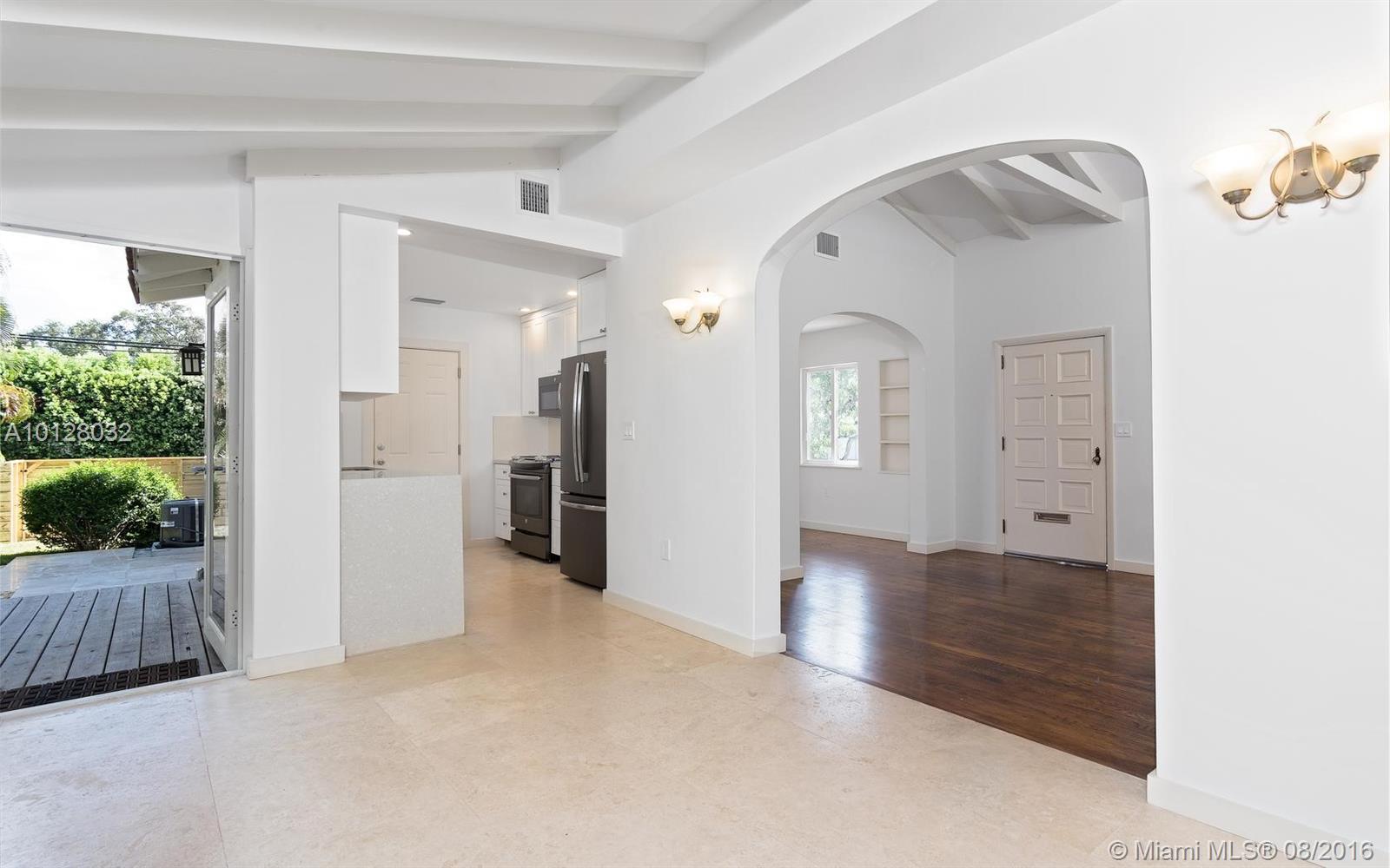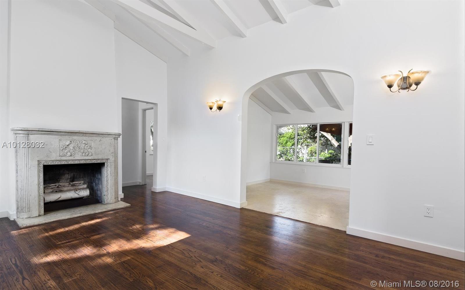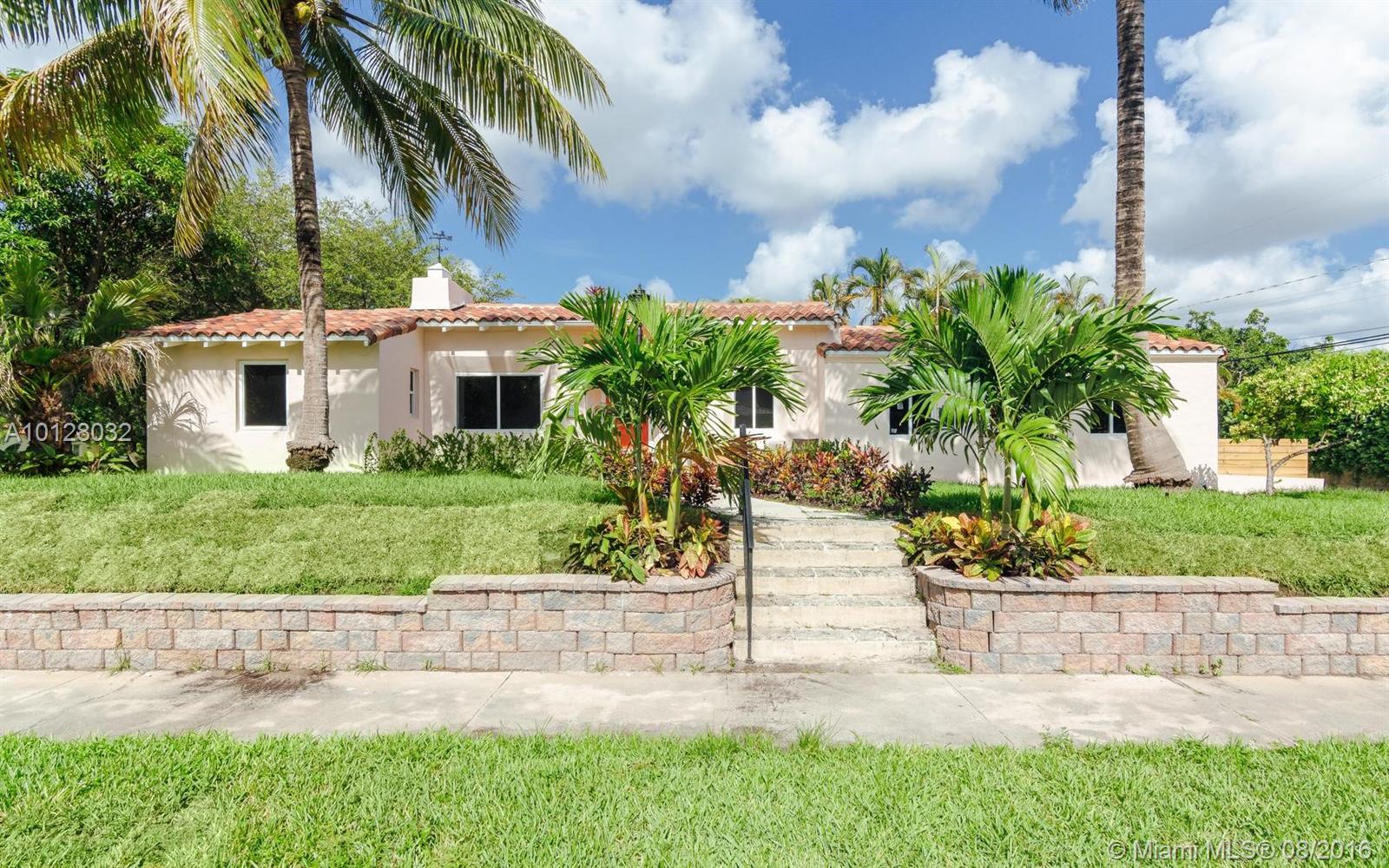 Completely renovated & detailed 2 bedroom, 1 bath home is situated on a raised corner lot centrally located in an excellent Miami Shores neighborhood. This 1939 home features open beam ceilings, arches, original oak flooring & a carved stone fireplace. Gourmet quartz kitchen with slate GE appliances & gas stove. The bathroom has floor to ceiling Italian marble & whirlpool tub. Attached 2-car garage with driveway off the alley includes new Samsung washer & dryer. Landscaping & patios in from & back yards.