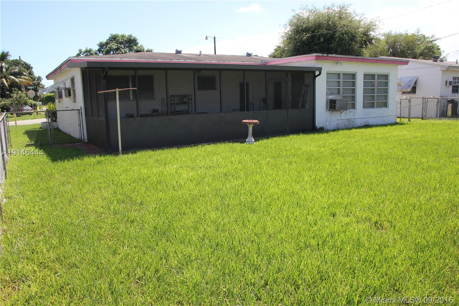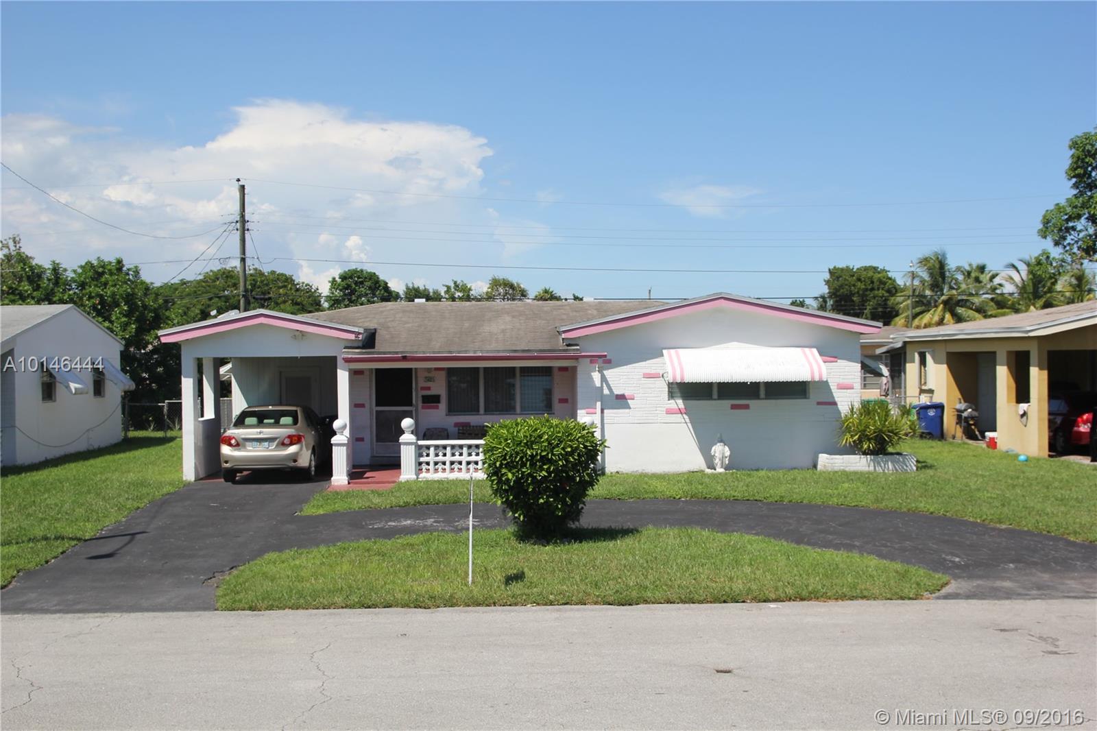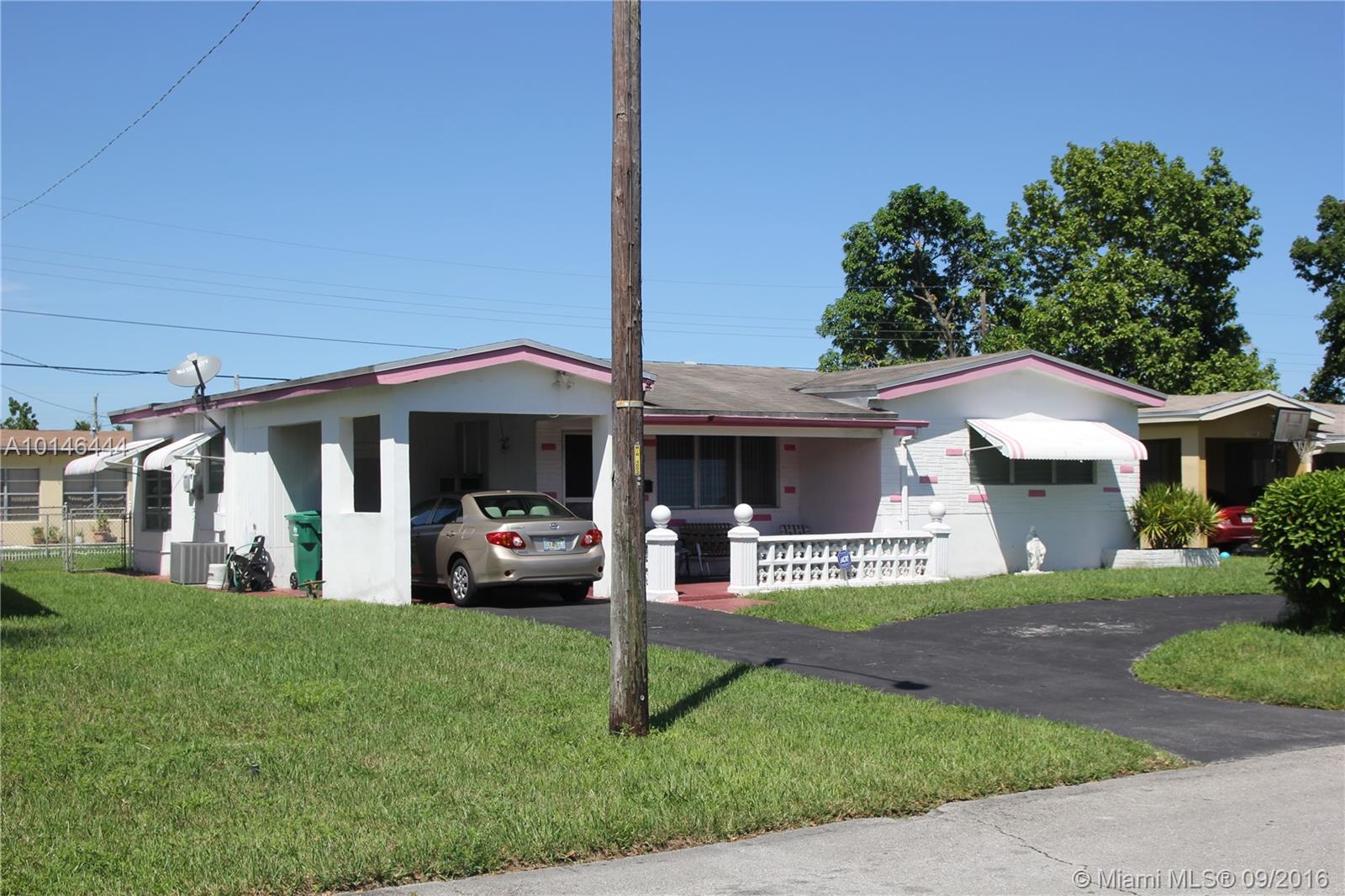 Charming and original 2 bed/2 bath single family home. Very well maintained yard with sprinklers, fence, and a covered patio out back. Room for a pool in the back yard. Brand new water heater and roof replaced in 2005. Great Investor/First Time Buyer home. NO HOA!! Close to Turnpike, I95, and Hard Rock Stadium. Circular driveway and covered carport for plenty of parking. Washer/dryer included in sale. Can be leased for $1500/month!
