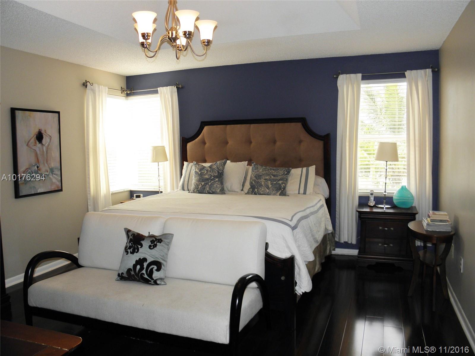 Lakefront house with pool/spa, centrally located in west Pembroke Pines just off I-75, oversize lot, beautiful backyard with tiki hut perfect to enjoy the best of South Florida lifestyle!! 3 bedrooms, 2-1/2 baths, tile flooring with beautiful laminated floors from the stairs up. Large covered terrace. Master bedroom with tray ceiling walk-in closet, bathroom with dual sinks roman tub and separate shower. Open eat-in kitchen. Gated community. Newer high efficiency A/C and tank-less water heater. Must see!