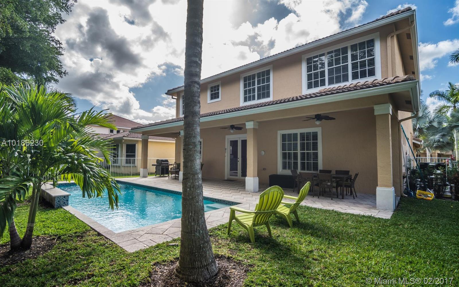Like New Construction in Weston Hills. Popular Santa Cruz model with BRAND NEW custom Saltwater system, heated pool w/expansive covered patio. No neighbors for pure privacy. Enter this beauty via Palm tree lined street. A Grand 2 story entry foyer welcomes you. White contemporary cab.in kitchen w/center island. Decorated in neutral tones, tile floors on 1st level & wood up. Full bed & bath down. MB is up w/sitting room. Freshly painted interior, 2 New A/C, plantation shutters, walk to community park.