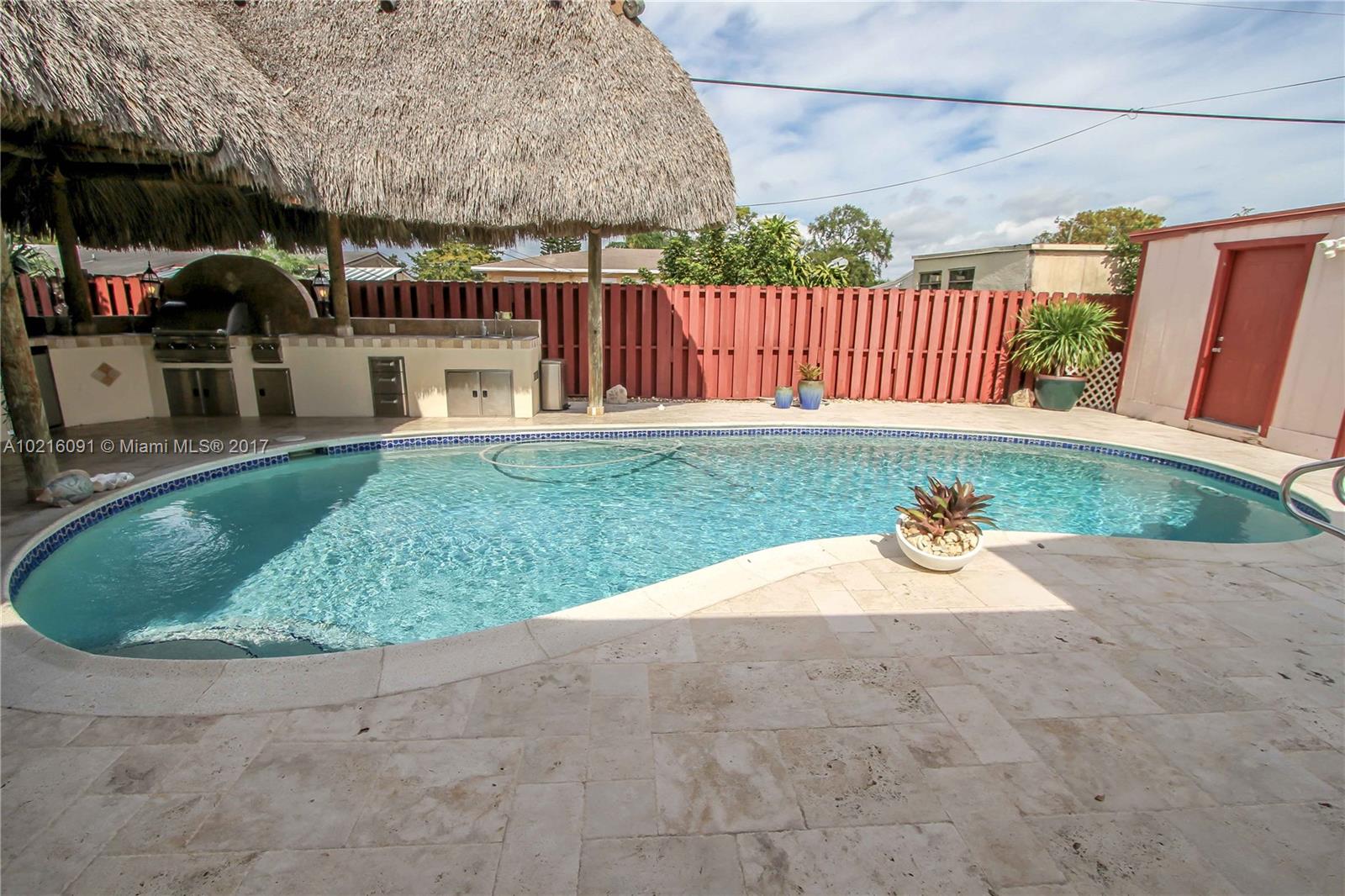Absolutely Beautiful House! Move in condition. 3 bed/2 bath plus den/office. Completely updated kitchen & bathrooms. Great for outside living & entertaining. Large Tiki hut with state of the art outdoor kitchen including grill & fridge. Professionally landscaped w/new sprinkler system. Resurfaced saltwater pool. Roof replaced in 2014. Alarm system. Crown molding in kitchen, living & dining room. Converted garage.