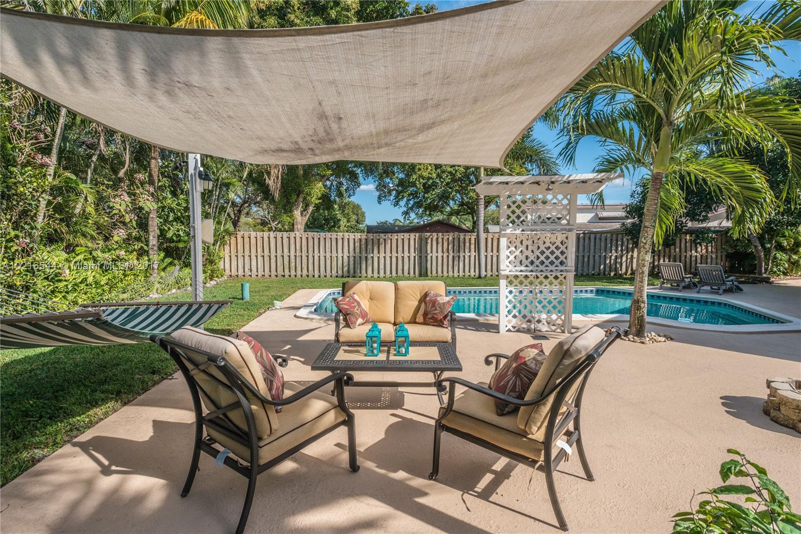 Escape to your own tropical oasis. This 3BD/2BA features all the comforts you expect in a home. Open layout makes for a flexible space. Kitchen has stainless steel appliances, eat-in kitchen and plenty cabinet space. Master suite has walk-in closet, sliding glass door overlooking pool deck, glass encased rain shower. Covered patio, sprawling backyard, gas firepit, sparkling pool, great to entertain. Landscaping provides privacy and tranquil breezes. Bring your pickiest buyer, home will not disappoint.