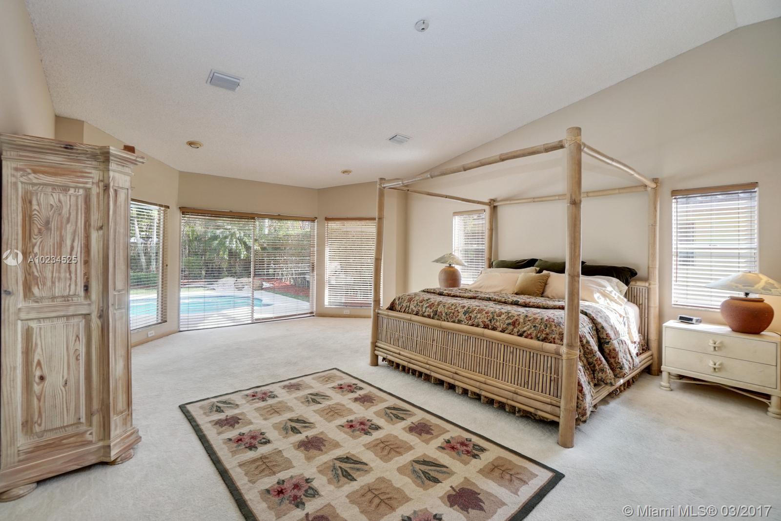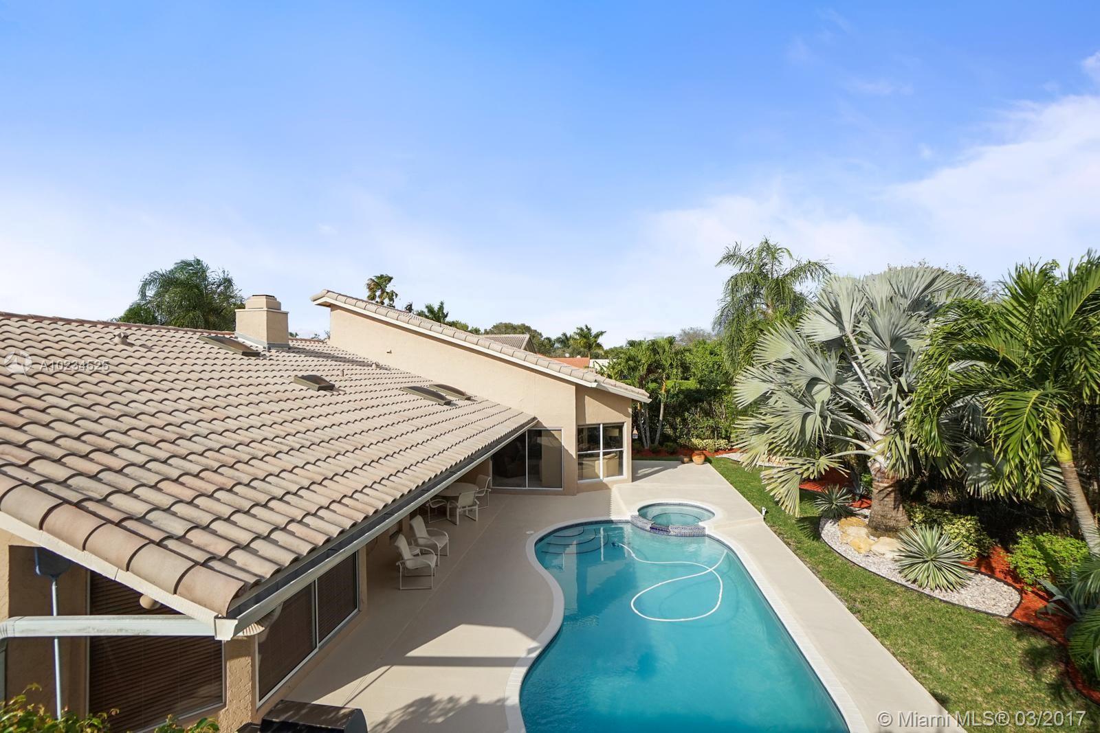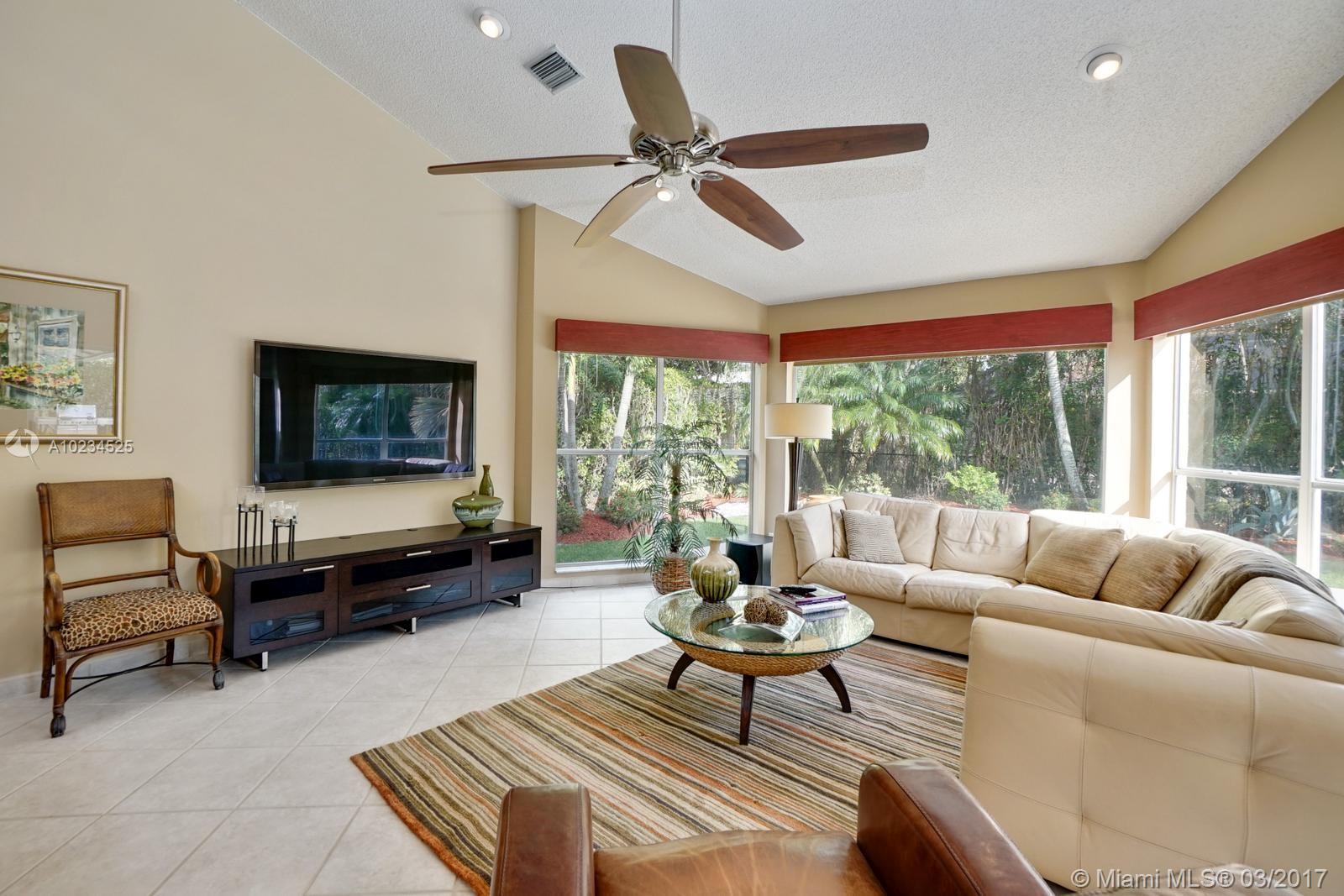 Lush tropical professionally landscaped home will have anyone feeling carefree and ready to kick up their feet and just relax.Vaulted ceilings with skylights bring the tropics of South Florida inside.Picture windows throughout the home continue natures beauty.Recently updated kitchen and new appliances with island make this the heart of the home for entertaining guests and family members.Resort style outdoor area for large parties and holidays.Heated pool with saltwater chlorinator and manned Guard gate.