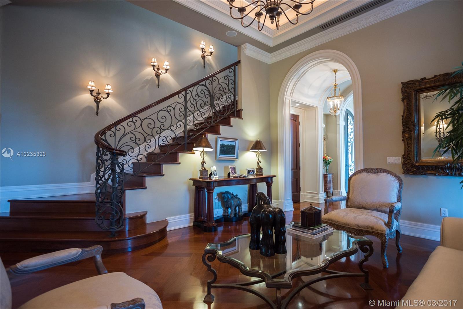 Exquisite Private Waterfront Residence, Enclosed Breezeway Entry, High Coffered ceilings, gorgeous Millwork, Summer kitchen,wine storage for 750 bottles, Gym, Gourmet Kitchen, Pantry, 5 bedrooms, 4 Baths on 2nd Floor, balconies, Elevator. 6th Bedroom Suite on first floor, now used as Office. Expansive Private Master with Sitting Area, luxurious bath, extra large closets. Terraces overlooking Pool and water views. A truly beautiful home. 2005 Winner, Best Custom Home Platinum Award. 15,428 Ft Lot.