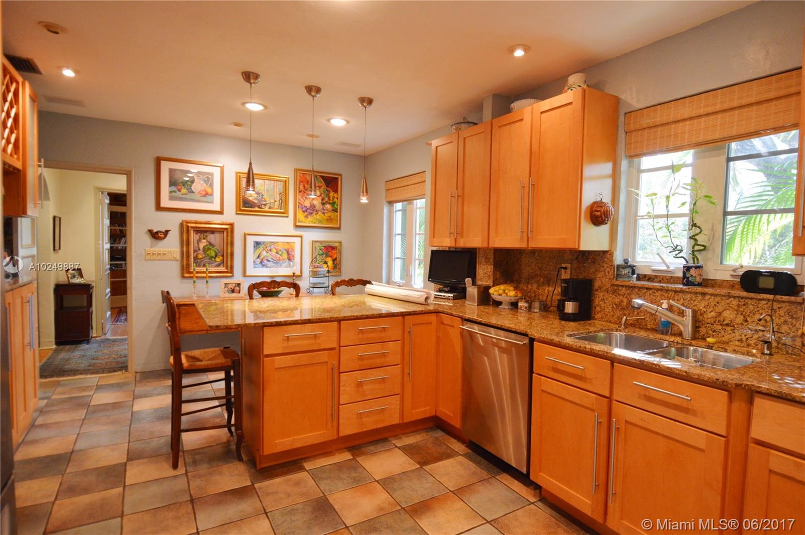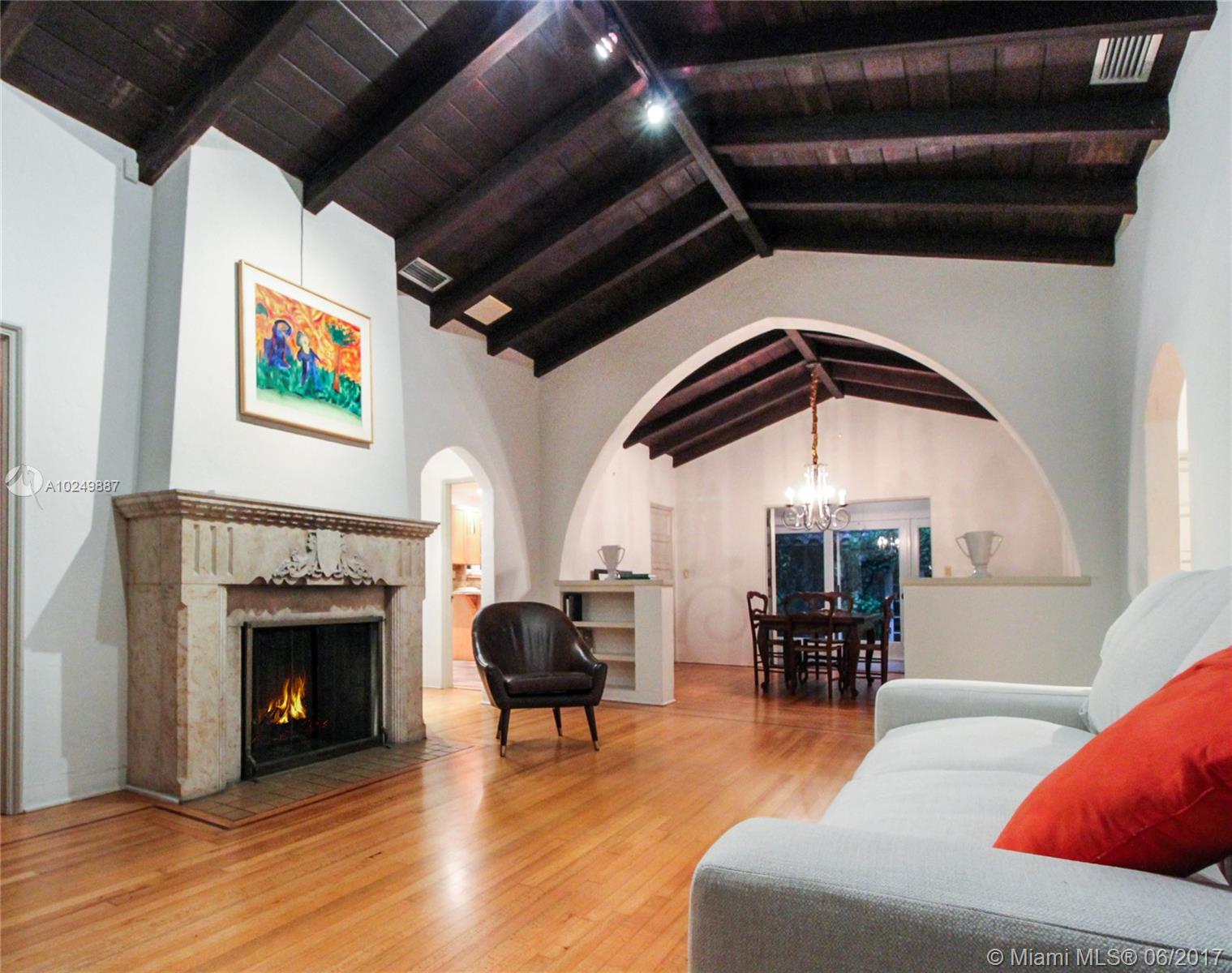 Charming, artistic 1936 Spanish-Deco 3/2 with large living room with dramatic cathedral ceiling & wood-burning fireplace, formal dining room, large eat-in kitchen, impact glass doors and windows, 2000 sq. ft on 8,347 sq ft corner lot on close in street within EZ walking distance to downtown Coral Gables. Garage with attached artist's studio. This home offers A+ location, historical charm and character and modern conveniences such as impact windows and over $8000 of new plumbing within the last year.
