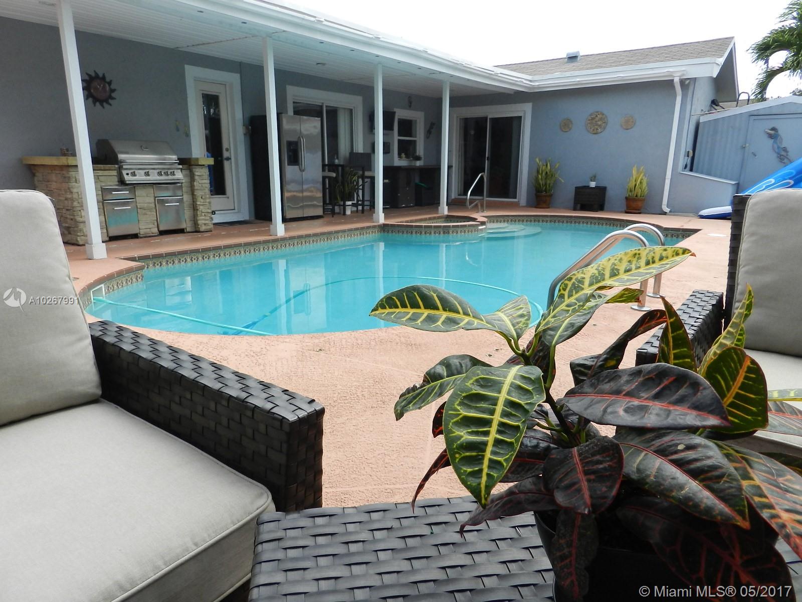 Wow! Gorgeously remodeled pool home in the heart of Pembroke Pines & in move-in condition! Stunning kitchen remodel with espresso cabinets, soft close doors and drawers, stainless steel appliances and tons of cabinet/counter space! Both bathrooms upgraded to the max - 2nd bath with cabana door to pool! Real hardwood floors in living/dining room - neutral tile throughout rest of home (no carpeting)! Relax on your covered patio overlooking the inviting pool area! Pool equipped with salt water chlorination system and baby fence! Yard on either side of the home with your own mango tree! Other features include spacious rooms, split floor plan, snack bar, AC replaced 2013, circular driveway, recently painted exterior, 4th bedroom currently used as office but there is a door, closet, and window.