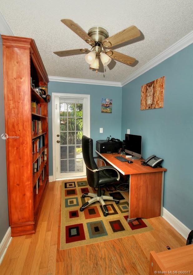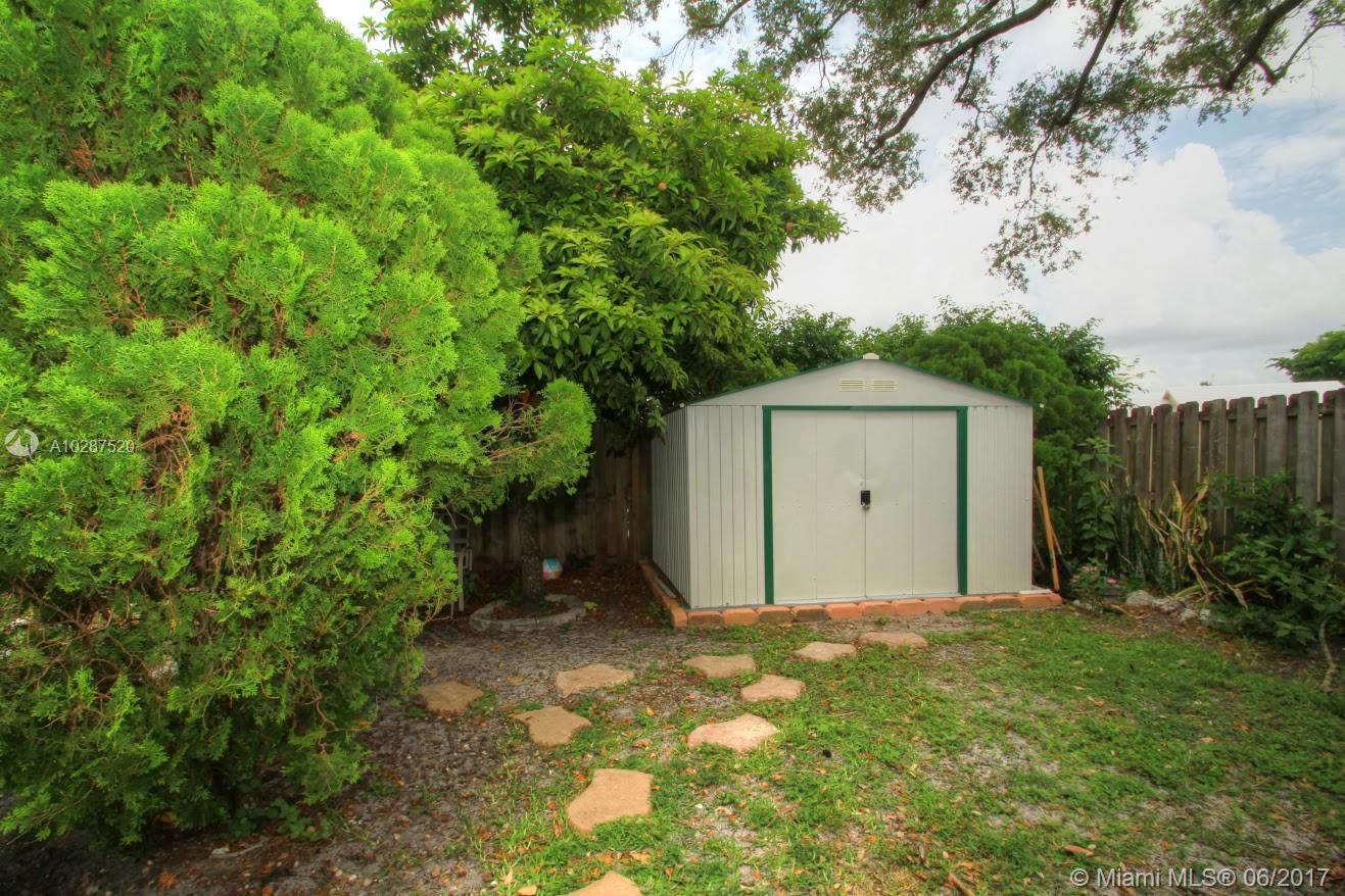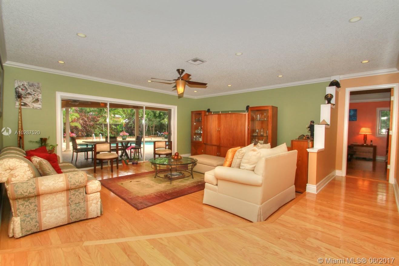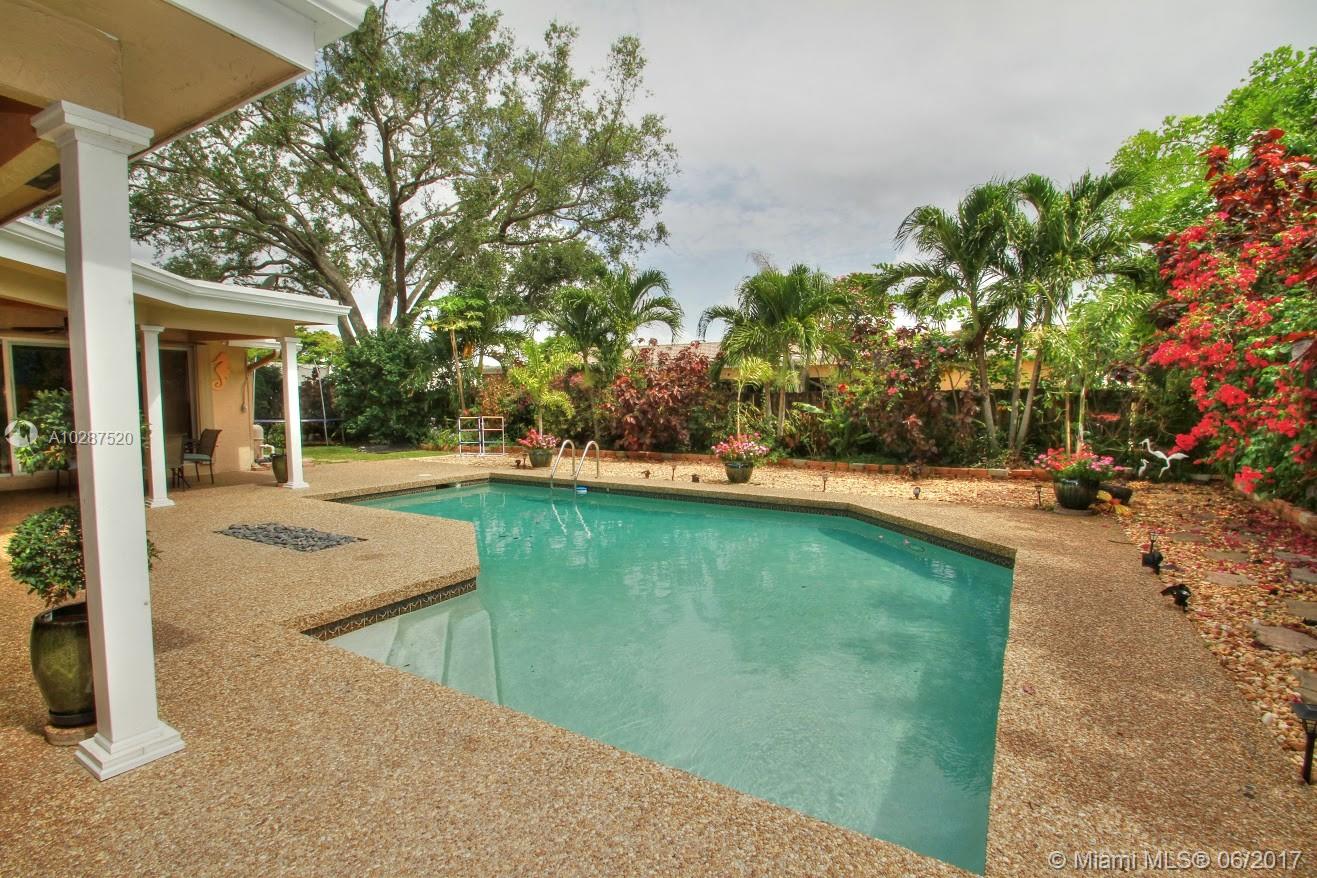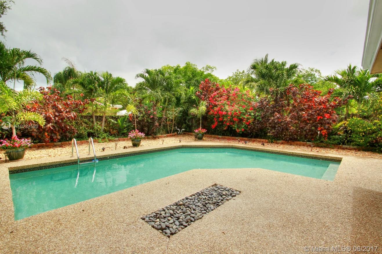 Totally remodeled 4/3 plus office. Spacious corner lot professionally landscaped with circular pavered driveway. Accordian storm shutters. Double door entry with inviting foyer. Remodeled kitchen with granite and wood cabinetry. Very spacious master suite with double vanity and Jacuzzi tub. Additional features include crown molding, solid wood floors throughout main living areas and custom wet bar with wood and granite. Expansive sliders overlook large and private covered patio. Central a/c 2014. New Barrell Tiled Roof mid 2001. Newer refrigerator, microwave. Solar water heater. Shed. Fabulous fruit trees: mango, sapadillo, guinep and papaya. Sold as-is.