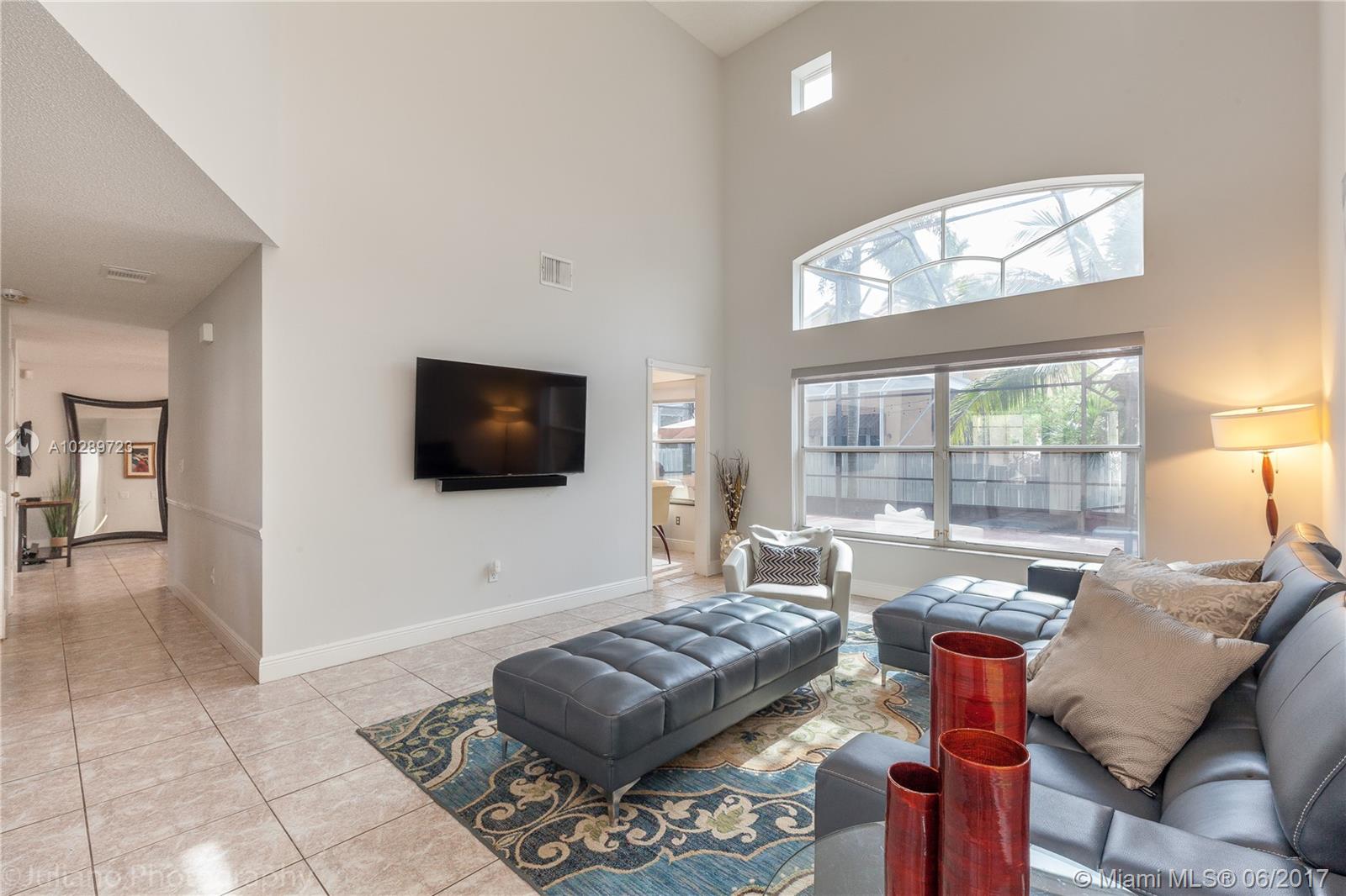 Exclusive 24 hours guarded gated community in sought after Pembroke Pines! 4/2.5 Mediterranean beauty, 2 car garage, 2 story domed screened patio perfect for entertaining! Home sits on large corner lot! Gourmet white kitchen with upgraded appliances, granite counters and deep chef sinks. Laminated floors in bedrooms and stairs, huge master bedroom suite, family room, formal dining and inside laundry room! Hi-Volume ceilings! A+ schools, walk to soccer park, close to shopping and major highways.