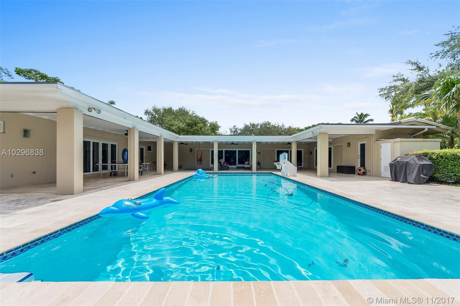 Fantastic 4 bedroom + office, 4 bathroom remodeled home situated on almost an acre on a quiet street in the Village of Pinecrest. Open concept living area includes large living room with charming keystone fireplace, casual dining area & beautiful kitchen with stainless steel appliances, island, wooden cabinetry, and eat in snack bar. Formal dining room. Family room with wet-bar and full cabana bath. Master suite features customized walk in closet with built in shelving. Master bath has vanity, double sinks, separate shower and tub, beautiful stone tile. Expansive covered patio with retractable electric screen. Tile flooring, plantation shutters and impact windows throughout. Indoor laundry room. Wonderful, private back yard with swimming pool & basketball court. Oversized two car garage.