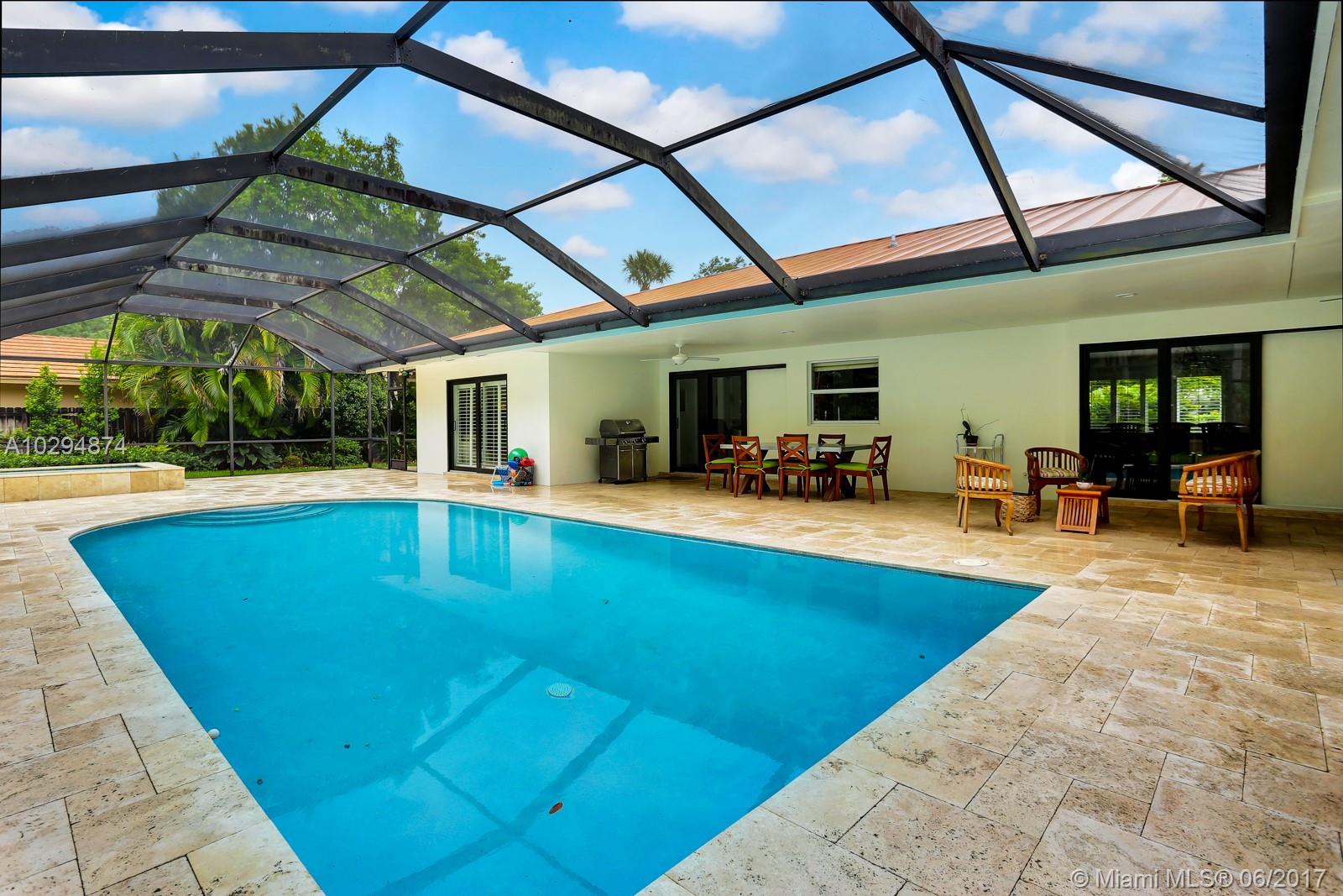 North Pinecrest totally remodeled residence on builder's half acre with private screened saltwater pool & jacuzzi with wrap around travertine stone deck & covered patio, lush landscaping and circular drive, metal roof new 2007, impact windows & doors, wood & tile floors. Large family room with wet bar, laundry room, split bedroom, master suite with walk-in closet, stainless steel appliances & granite counters, whole house Generac generator with automatic transfer switch & 1000 gal underground propane gas tank, sprinkler system, Zone "X" not a flood zone! Best school district!