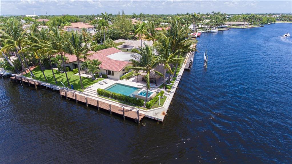 One of the most spectacular ICW point lots available with endless water views. This stunning 4bd/4ba pool home on a lot over 16,000 sq. ft. is seconds to the Hillsboro Inlet with 250 ft. of water frontage & two docks for your mega yachts. The extra large great room and gourmet kitchen is positioned perfectly with expansive water views. Entertain under the custom tiki hut with lounging and bar area or enjoy the beautiful resort style pool and spa as you watch the boats go by