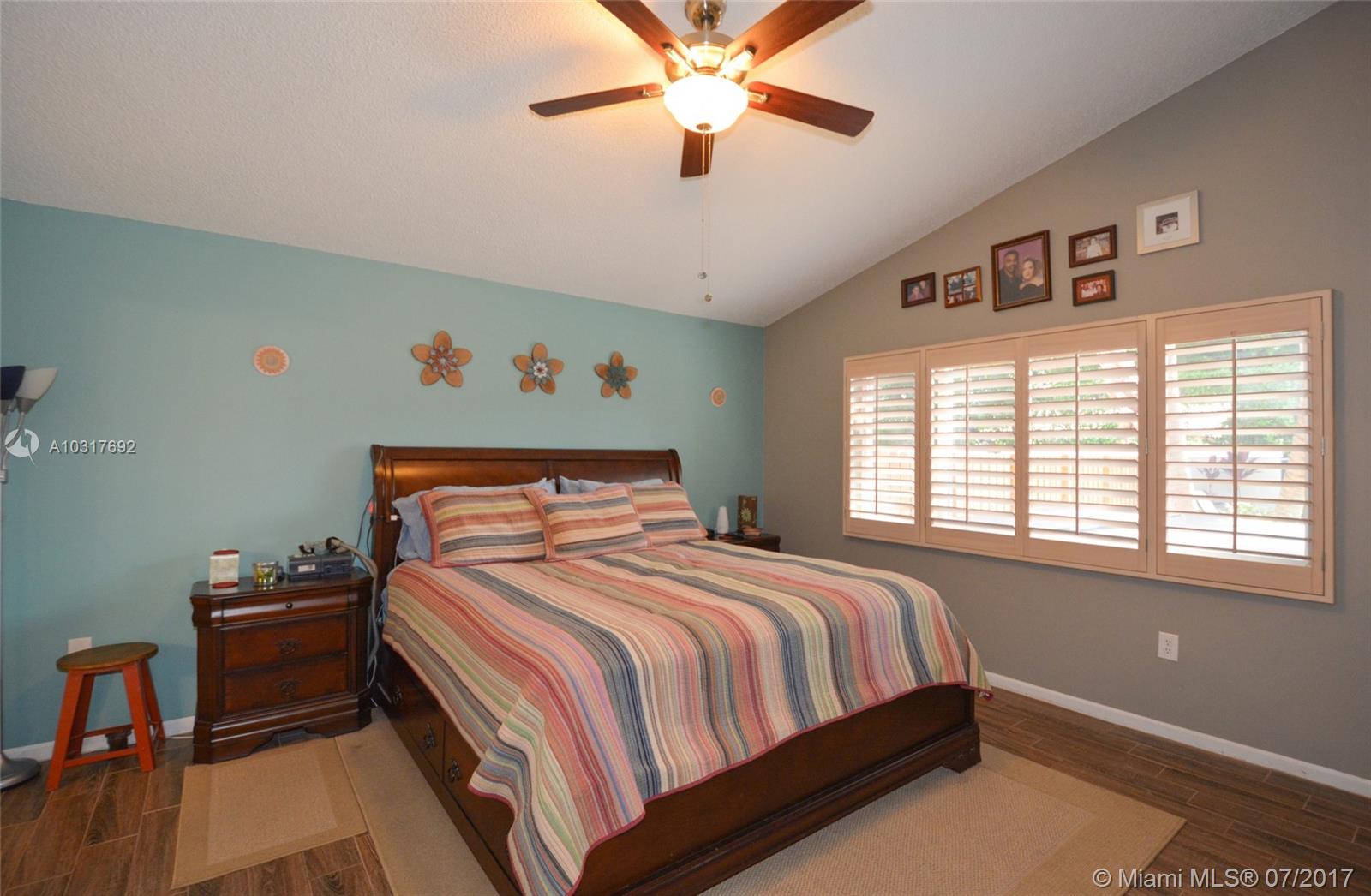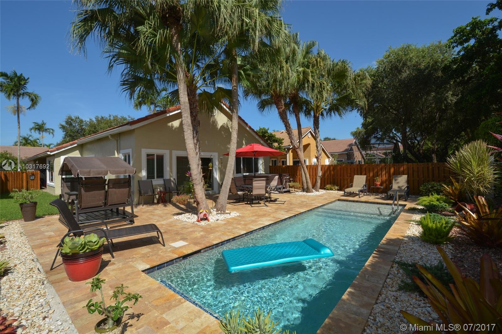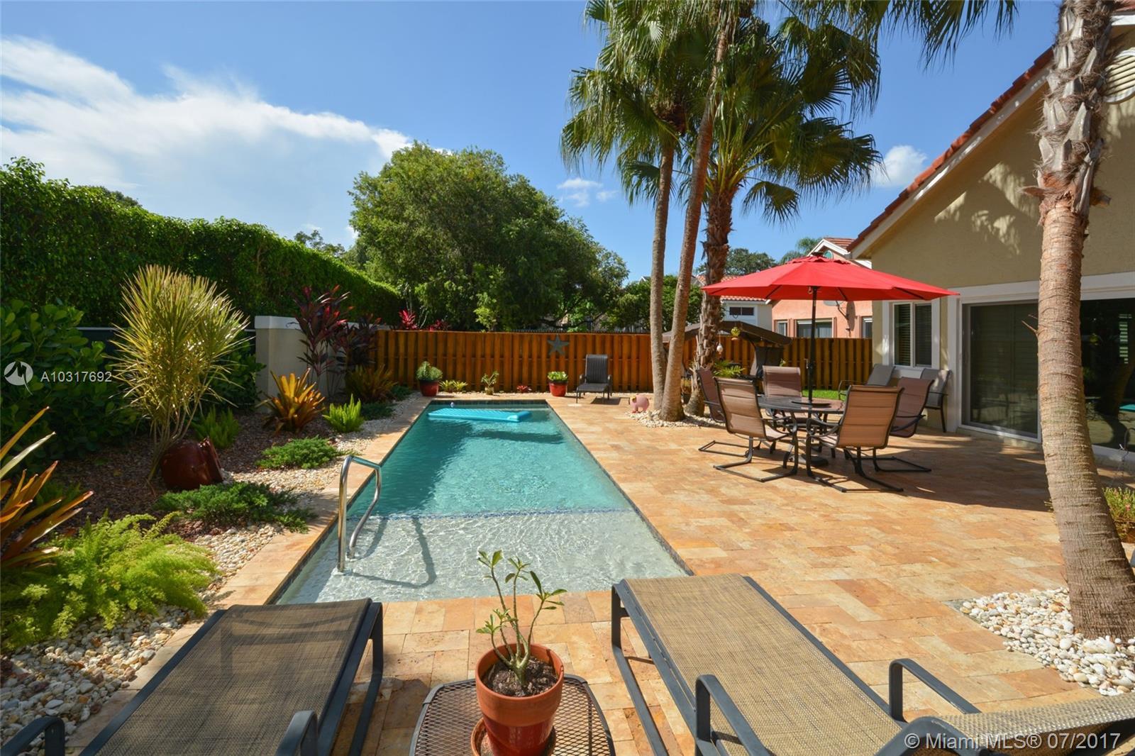 This Meticulously Maintained Pool Home is a Tropical Oasis nestled in the heart of Plantation's Premiere Jacaranda District. Prime Location in the gated "Sunset Cove" community, this property is extensively upgraded with high end appointments such as Hurricane Impact Glass throughout 9/14,All Tile in Bedrooms 2/15, New A/C 6/15, New Pool with Sun Shelf Huge Open Patio w/ Tumbled Marble Pavers, Palm Trees, Lush Landscaping..Perfect for Entertaining in South Florida Style! Inside, warm inviting colors, high vaulted ceilings, Upgraded Kitchen with Granite, SS Appliances, Mosaic tile backsplash, crown molding, Plantation Shutters throughout. Extra long driveway, Fenced yard and additional side patio! Centrally located close to Shopping, Fine Dining, Parks. Walk to A+ Rated Elementary school!