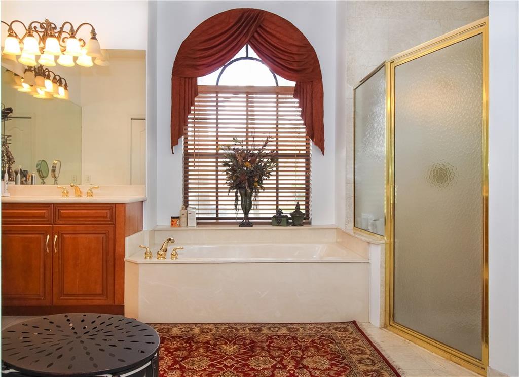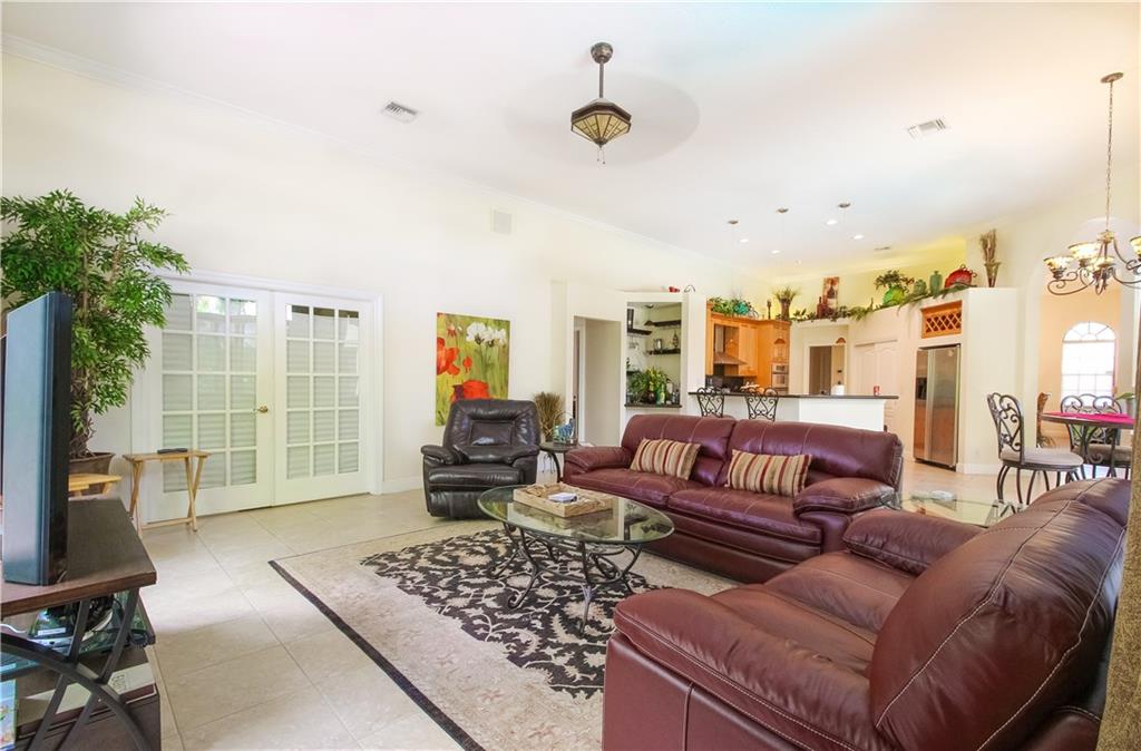 Gorgeous one story home with 5 bedrooms plus a nursery/office/work out in the master bedroom. Beautiful kitchen with rich real wood cabinetry, granite countertops, stainless steel appliances, snack bar, breakfast area and huge pantry. All bedrooms have wood laminate flooring, main areas have tile. Upgraded lighting throughout home. Custom draperies/window treatments in living areas. Backyard is completely private with lush landscaping. Home sits on a large corner lot. Covered seating around the pool.