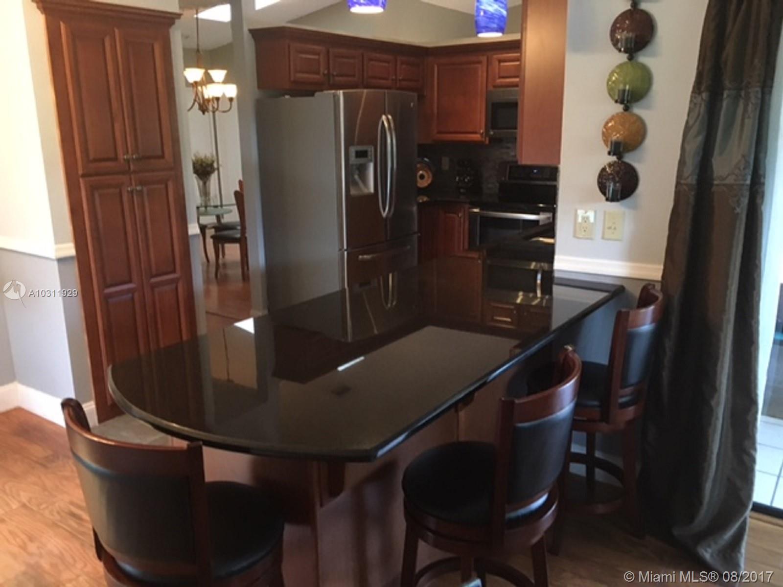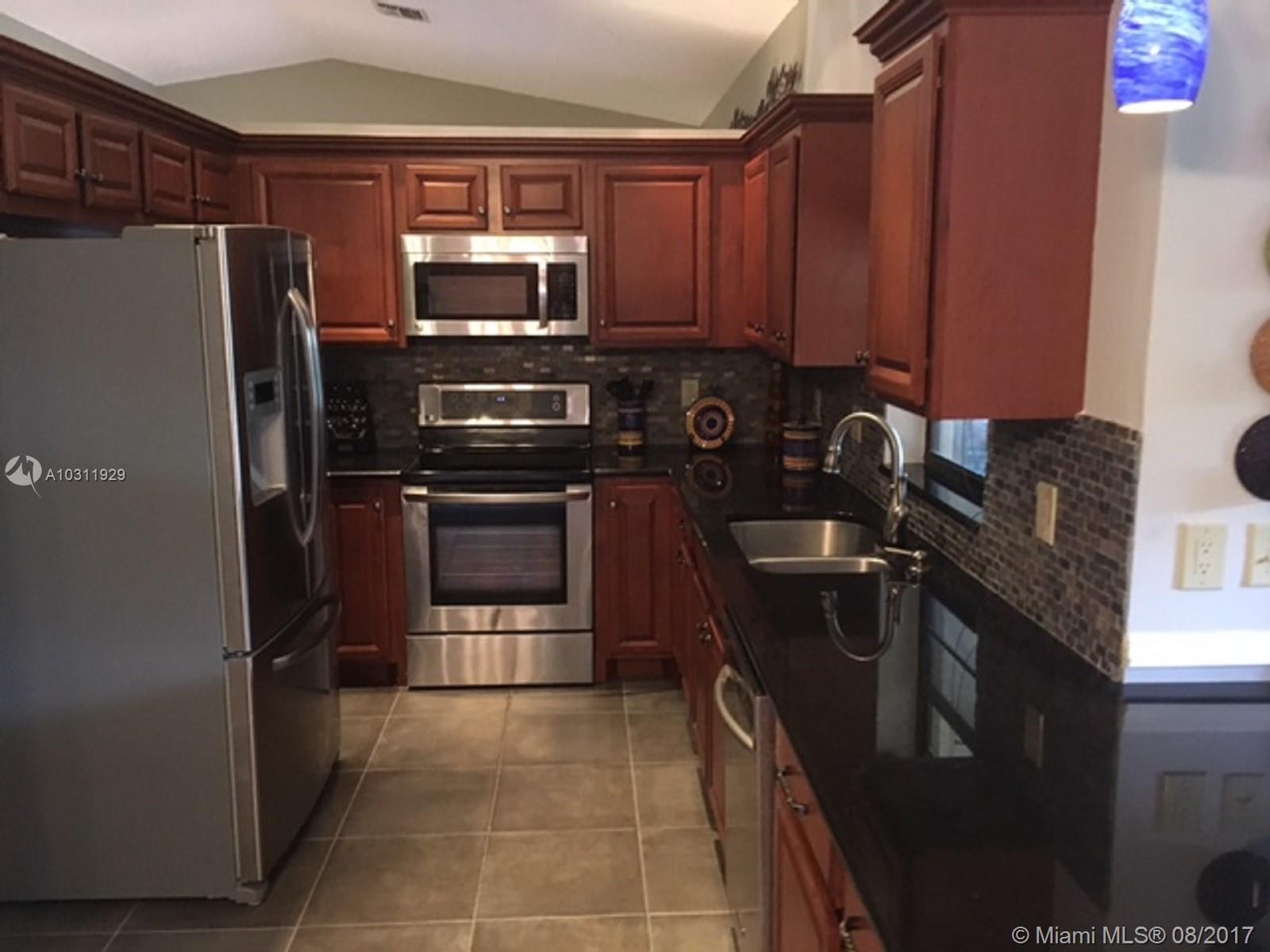 Lovely home on canal! As you enter, you are immediately drawn to the lovely lush tropical landscape seen from the sliding glass doors in the living room, kitchen and master bedroom. The living room and formal dining has wood floors and updated baseboards with an open pass thru from the amazing new kitchen. New wood cabinets, and black granite countertops with an extended counter to sit and enjoy your meals or entertain your guests. Beautiful backsplash, stainless steel appliances with tile & wood floors. Kitchen has two areas for a dining table and/or sitting area with sliders that open to the screened enclosed lanai and private tropical patio. Wood floors in master and carpet in 2nd and 3rd Bedrooms. Accordian Hurricane Shutters.