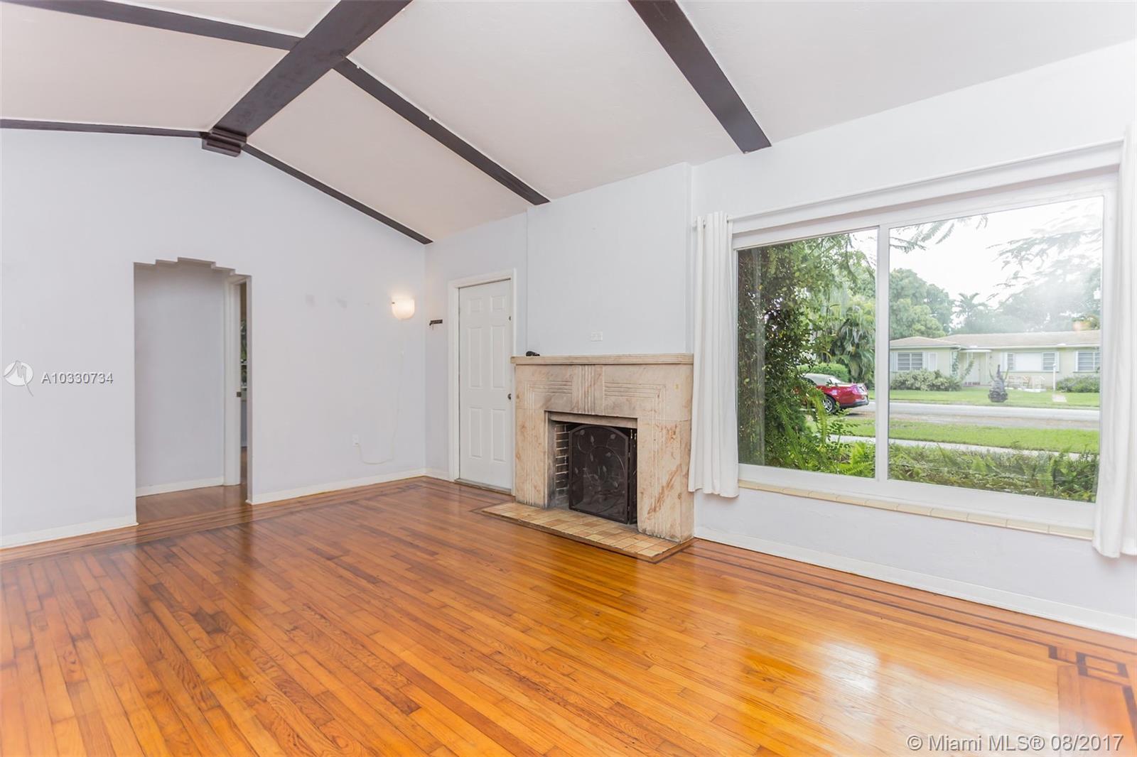 Beautiful 3/2 home in the perfect location of Miami Shores. Open and bright with high wood beam ceilings. Living room has original wood floors and a fireplace. Original wood floors are also in bedrooms and formal dining. Beautiful kitchen with stainless steel appliances next to a huge family room that’s great for family gatherings. House is located on a big corner lot with fenced in yard, timed sprinkler system, matured trees, and outdoor patio that’s great for BBQs. All windows are impacted, shutters for all doors (including garage door), and roof was done in 2013. House perfected located!! Minutes from I-95, walking distance to banks, post office & coffee shops. Close to police station, fire station, village library, Miami Shores Country Club, Barry University and Tot Lot for the kids.