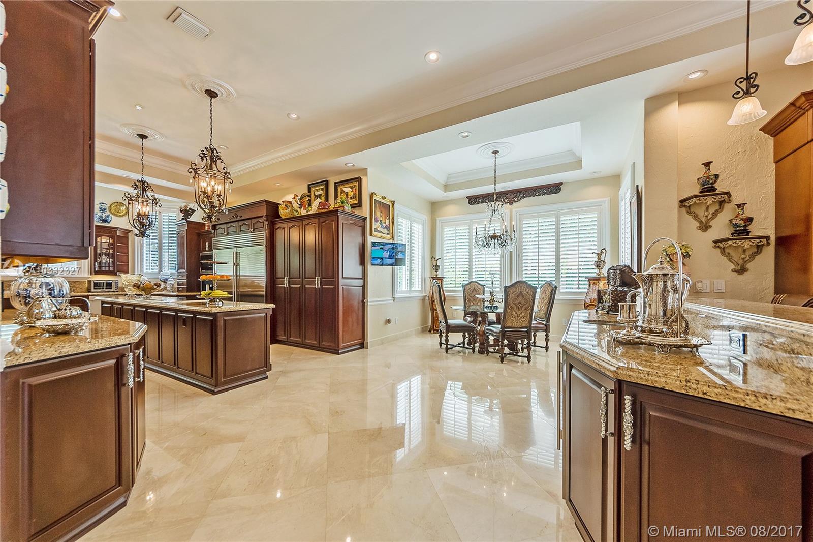 Elegant Mediterranean Estate. Situated on a pristine corner lot in N. Pinecrest. Upon entering this luxury estate, you will enjoy feature such as a exquisite flowing fountain, dramatic 2-story foyer & grand living room w/fireplace. This immaculate home features a open gourmet kit. w/top of the line appliances w/ breakfast area, cabinetry & granite counter tops, ornate crown moldings, coffered ceilings, summer kit., courtyard, large suite style bedrooms & grand master suite, marble & hardwood floors, balconies, large pool & spa, manicured grounds.