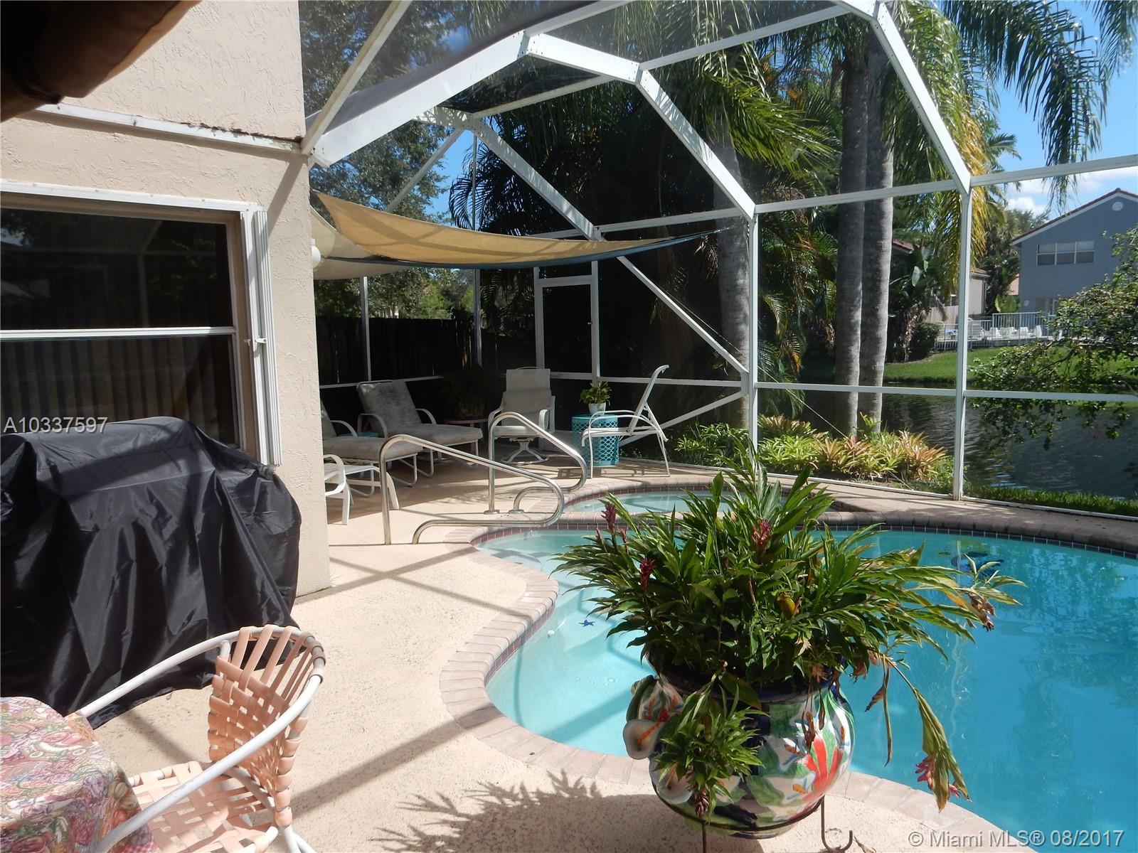 True pride of ownership shows in the clean spacious rarely available one story located on great culdesac location with great water views on private custom landscaped lot complete with heated pool & spa & accordion shutters. Great closets, 3rd bedroom being used as den/office with built ins, remodeled kitchen with white shaker cabinets & granite countertops. Master bath features double sinks, roman tub & separate shower. Enjoy the private serene setting in your screened patio while enjoying the heated pool & spa . This home features sun shade canopies, hurricane screening over covered patio, textured ceilings (no popcorn), Roof replaced about 10 years ago & exterior painted about 2 years ago. Enjoy great Bridgewater community with low maintenance, small clubhouse & 2 community pools.