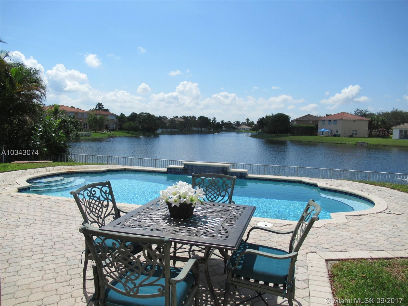 Spectacular view of the lake in this large 5/3 home in Monte Carlo Estates, a gated community. Exterior recently painted, double door entry, volume ceilings, spacious living, dining and family rooms, large kitchen with an island, breakfast area and stainless steel appliances. One bed/bath downstairs, covered patio leads out to the pool, 3 car garage, and the home has a mixture of accordion shutters and panels for hurricane protection. Ready for a new owner!