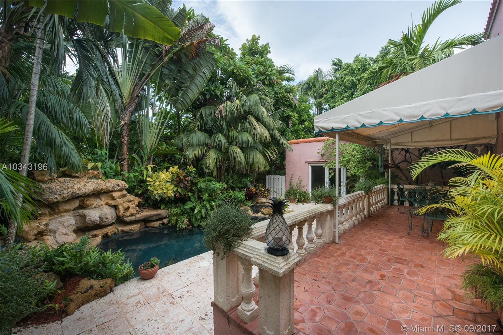 New Listing! 1930's Grand Dame on a 10,412 ft walled compound. Home is perfect for entertaining. 5 bedrooms, 5 baths. Foyer entry with staircase. Upstairs: three bedrooms and two baths, all with large closets. Downstairs: LR, Formal DR, updated kitchen, Sun Porch, Office, Guest bedroom and bath, maid's bedroom and hall bath. French Doors from LR and DR open to expansive covered terrace that overlooks the tropical pool, spa, and cascading waterfall. Separate large Family room next to pool with bar and full bath for in-law suite. Hardwood floors, high ceilings. 2-car garage. Lushly landscaped. 3,847 adj. sq.ft. Near Cocoplum Circle off LeJeune.