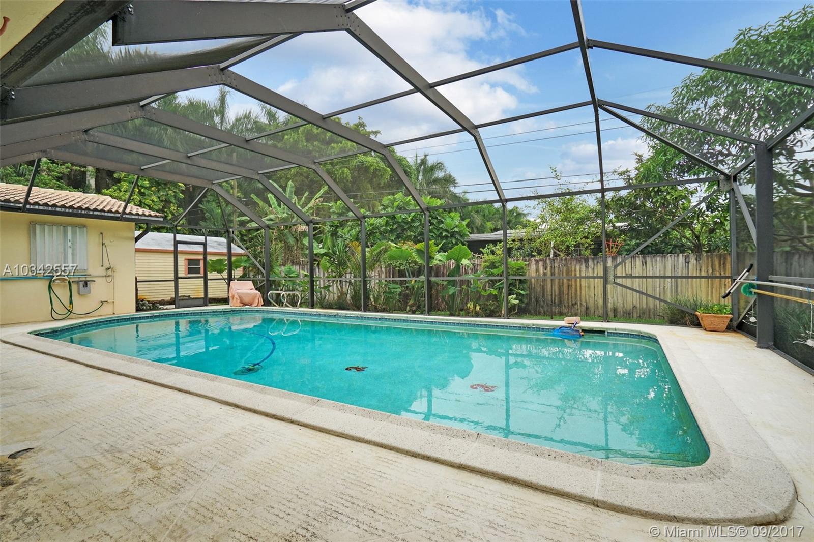 This is a great home. There is a large screened in patio with a pool and still room in the back yard for kids to play. Located on a quite dead end cul-d-sac. It has a two car garage and a shed. This is one of the bigger homes on the street. There are accordion shutters on most of the windows. The back bar on the patio and the bay window on the front have aluminum panel shutters.