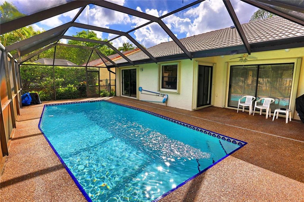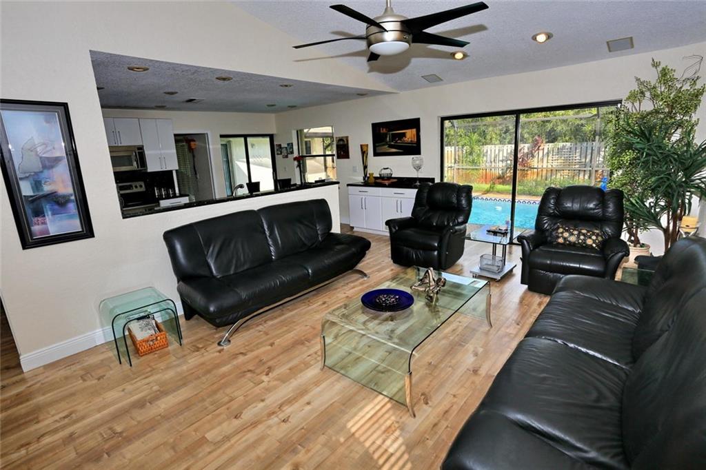 Spacious, 4 oversize Bedrooms & closets, 2 Baths, with pool. UPDATED kitchen, granite countertops, breakfast table & SS appliances. New, wood/laminate flooring. Abundant high-hats throughout, family room equipped with Surround Sound Pool diamond brite redone in 2015, both bathrooms has direct access to pool. New Roof in 2006, new a/c Oct. 2017, accordion shutters. Fully fenced backyard for safety of kids & pets. Walk to nearby parks. Truly a sensational home. Furnishings negotiable & motivated seller!