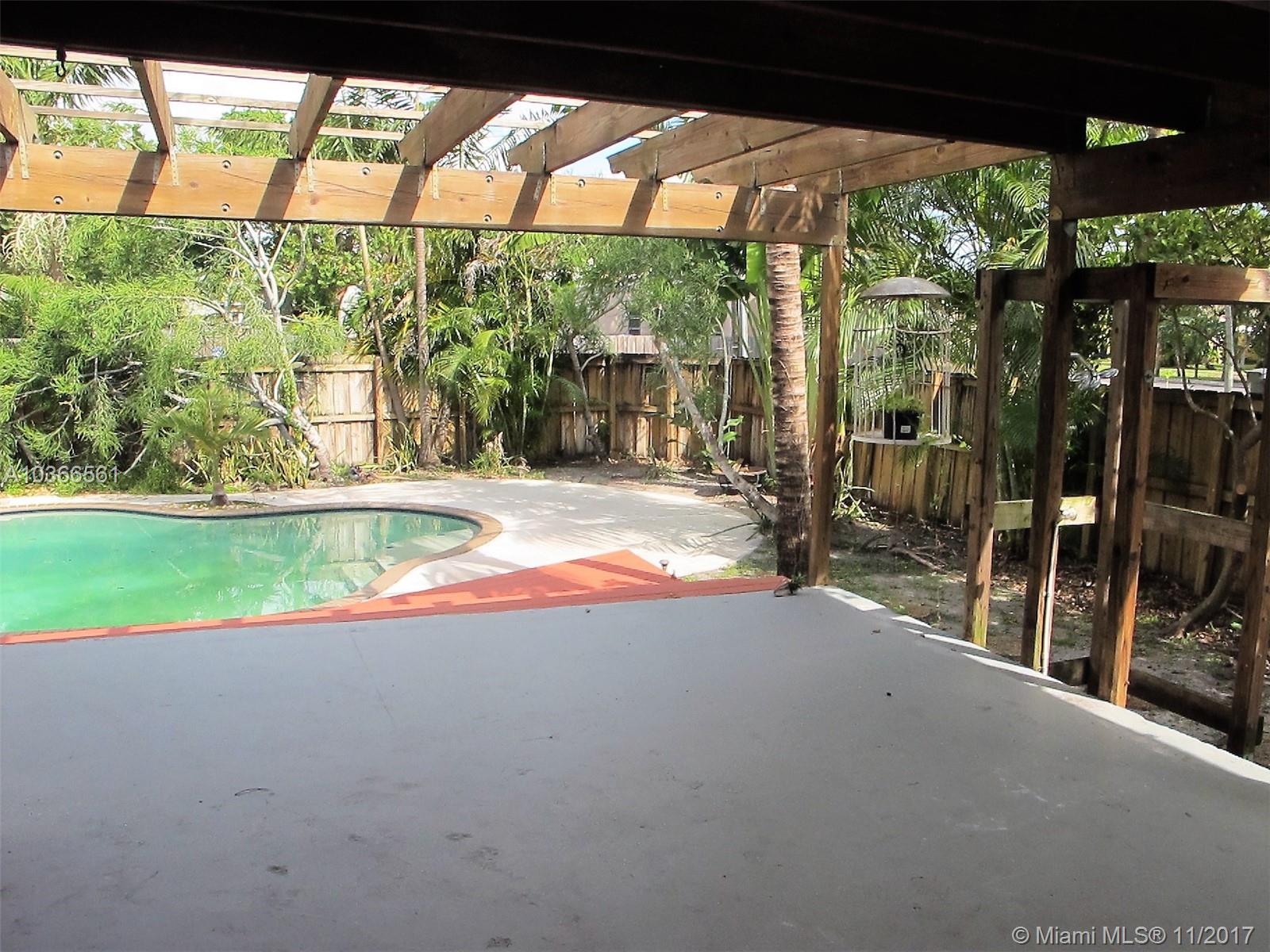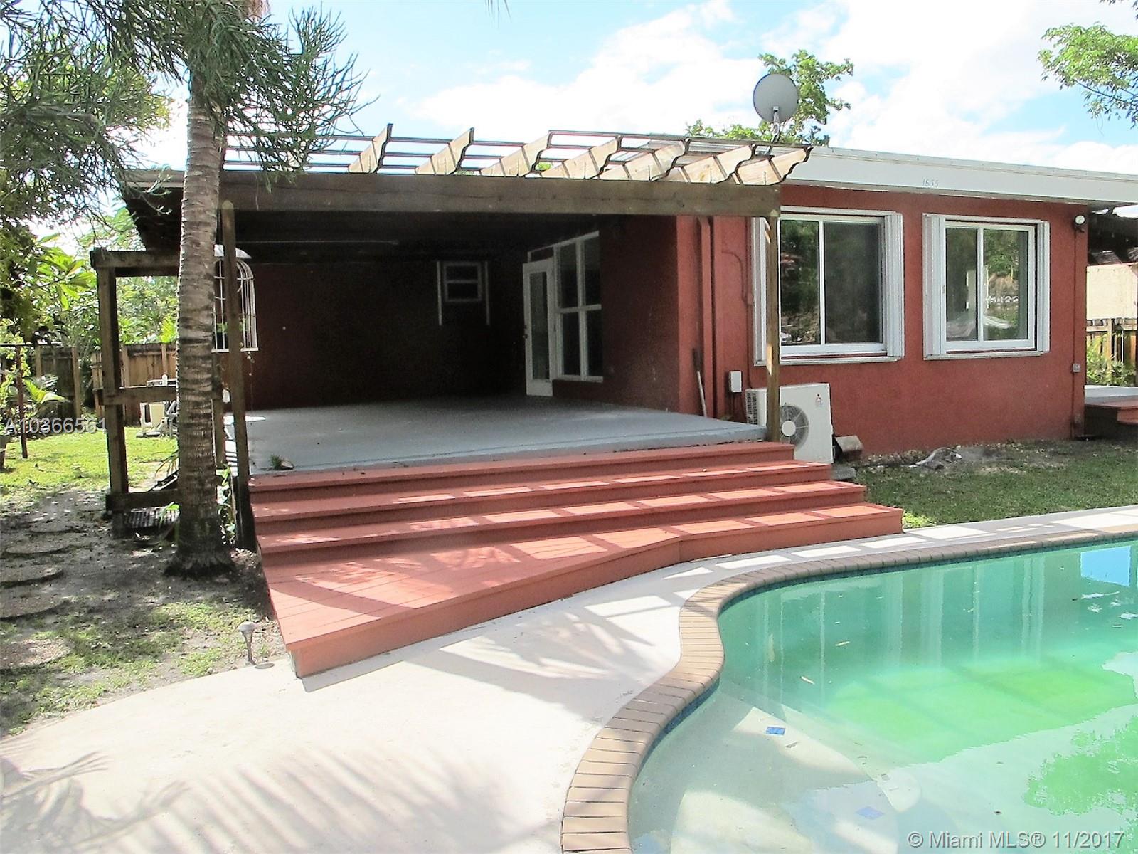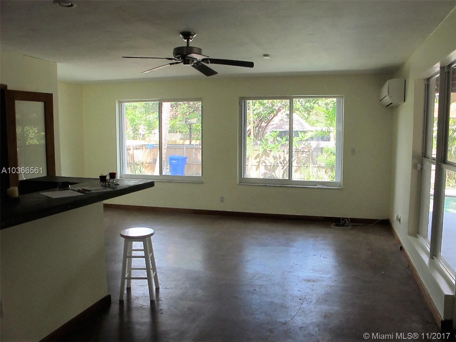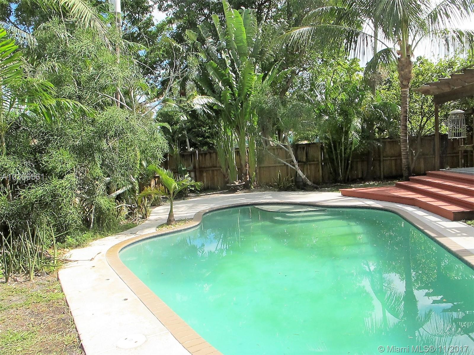 Open bright & spacious historic charm. Freshly painted. Family room which overlooks a gorgeous pool and huge yard. Property is privacy fenced . There are 2 outdoor patios with decorative pergolas, outdoor shower, tropical backyard with palm and banana, coconut trees and other exotic foliage. Hardwood floors, polished concrete floors, Hurricane protected , impact doors. New metal roof guaranteed for 100 years, new a/c. Priced to sell. Master bedroom off of hallway that also leads to side entrance of home for potential in-laws/guests or rental. Roughed in plumbing already in place in larger outdoor patio for additional large bedroom and bath.