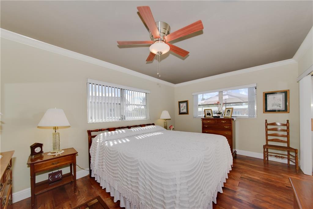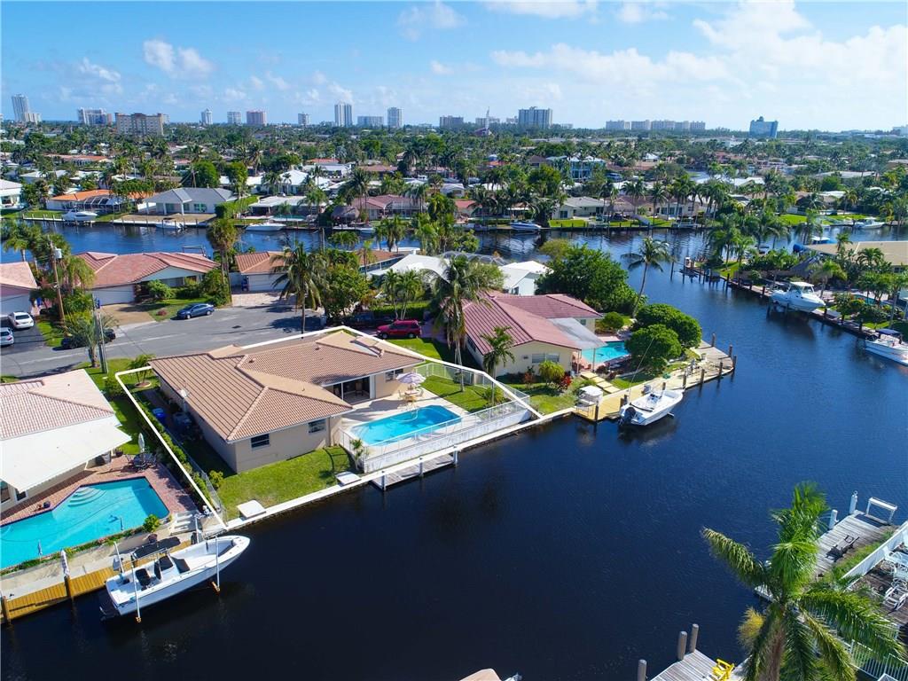 Updated 4 bed, 2 bath, 2 car garage, pool & 90 feet on the water w/ ocean access. Updates include a large, open kitchen w/ granite counters, SS appliances, breakfast bar & storage. Tile throughout, engineered wood in bedrooms, indoor laundry room, updated bathrooms, newer a/c, tile roof, gutters, hurricane protection & more. Large master bedrooms w/ sliders to the pool & walk in closet. Pavered drive way, large back yard, covered patio, pool & spectacular water views! One fixed bridge (Federal Highway).
