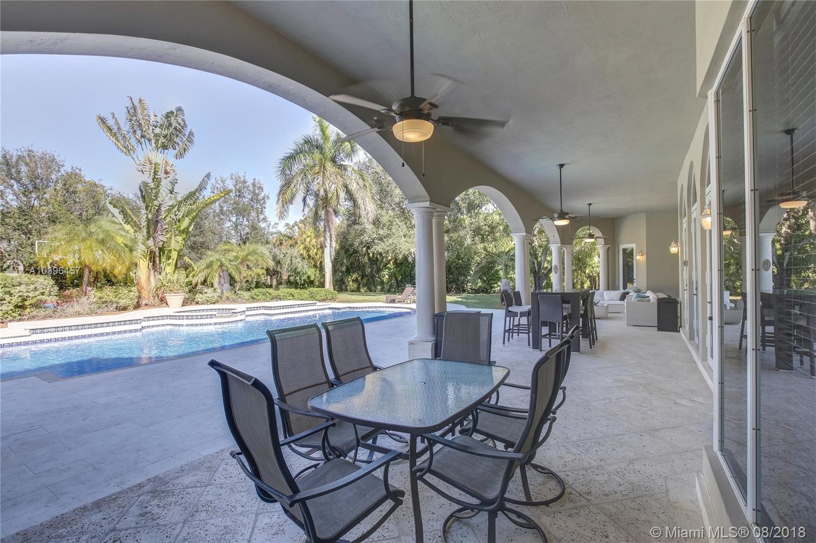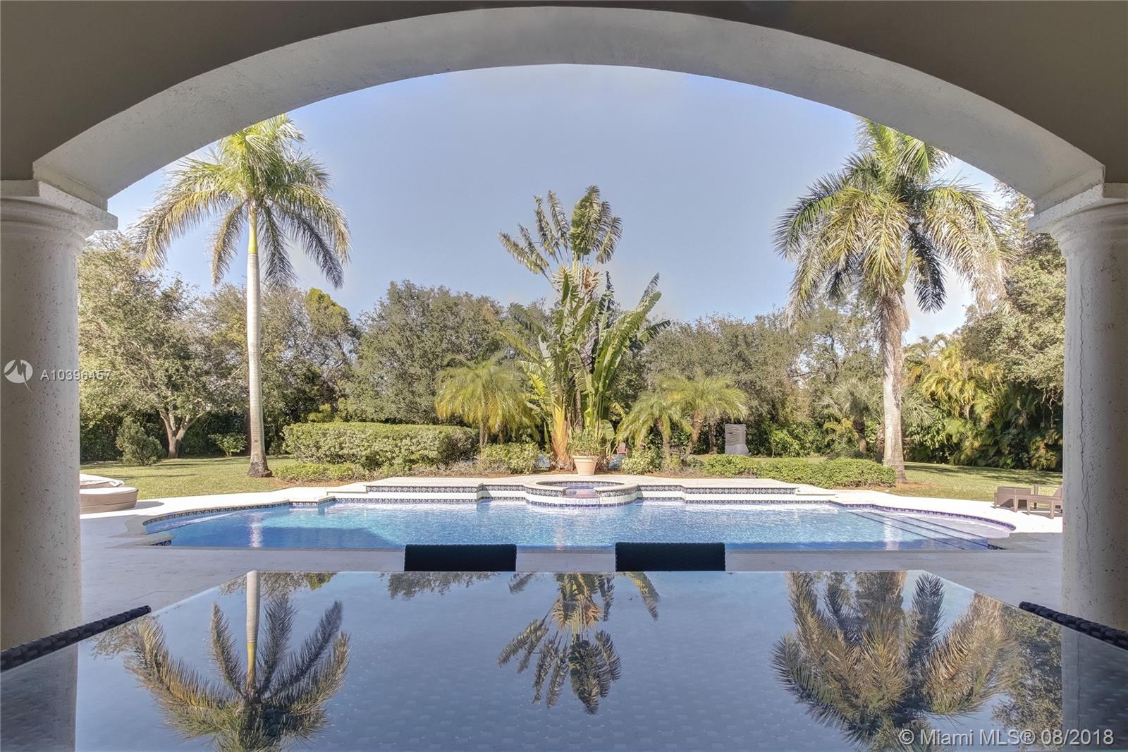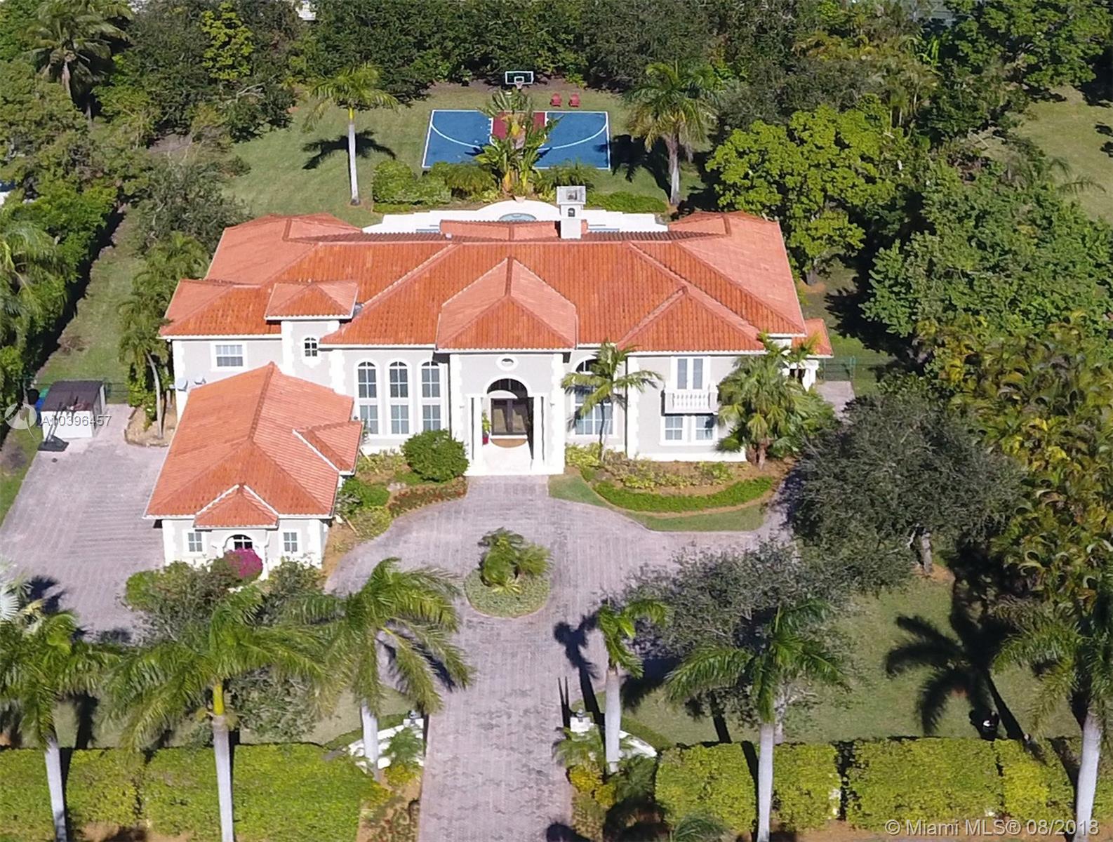 A majestic gated Pinecrest estate on a .9 acre oak-laden lot w/an exceptional floor plan & timeless elegance. Features include: impact windows & doors, 7 bedrooms (en suite), 7 1/2 baths, Family room, 3-car garage, heated Pool/Spa, & Sports Court. Grand foyer w/sweeping staircase, elegant Living room w/24 ft ceiling, Fireplace, & French doors that open to the expansive covered terrace & 51 ft heated pool & spa. Upstairs: Master suite w/a fireplace, sitting room, dressing room, 2 large walk-in closets, & access to a 63 ft balcony, plus 2 additional bedrooms. Downstairs: Guest room, Playroom, Home Theater,(potential in-law quarters); Staff rm, & 3-car Garage. The social areas enjoy 21+ ft ceilings & clerestory windows allow for natural day light. Room for a tennis court!