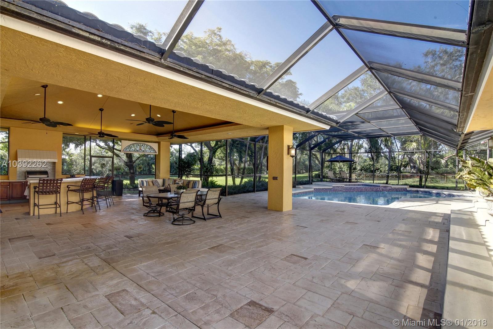 Luxury custom built home set back on a quaint cul de sac street. Enter this sprawling ranch via your circular drive with lush mature landscaping. Grand wood door welcomes you to this special entertainers delight home. Total Renovation in 2005. Enjoy gleaming marble floors with wood in all bedrooms. Step into your formal living room complete with fireplace, beamed ceiling and french doors to back yard oasis. Gourmet kitchen with oversized 10x5 center island, soaring ceilings, double ovens with sunny breakfast nook with windows overlooking pool. Custom office with tasteful built ins. Screened heated pool/spa with expansive deck including full summer kitchen, fountains, electric awning,lush tropical landscaping with lighting and Spacious guest house with full bath.
