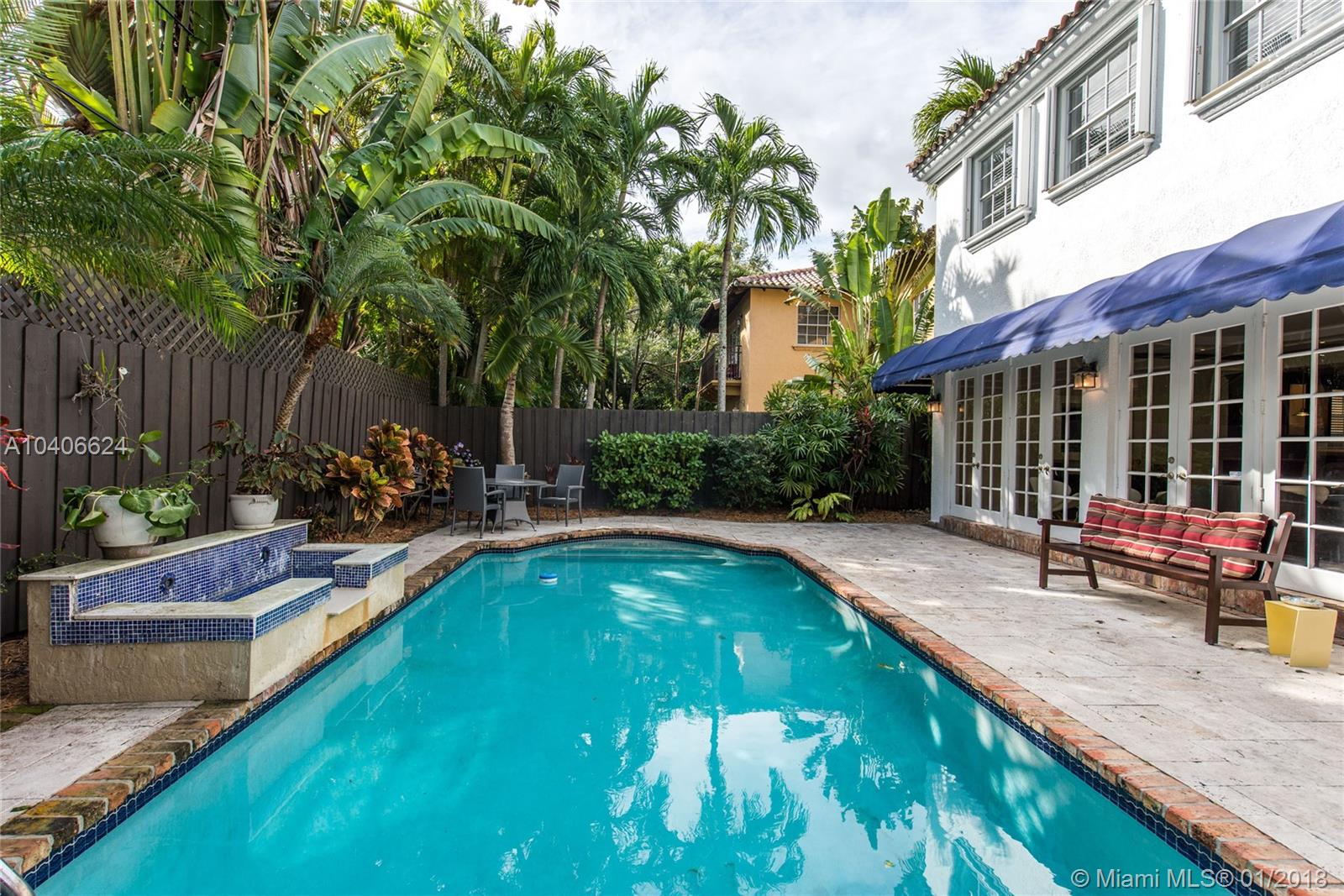 Lovely European-inspired home in lush South Coconut Grove. Dramatic double-height ceilings and clerestory windows create light-filled living spaces w/ a blend of classic and contemporary architectural features. Renovated in 2009. Expansive formal living & dining rooms overlook tranquil pool surrounded by travertine terrace. Elegant custom kitchen w/ wood cabinetry, granite countertops, top-of-the-line stainless appliances, center island & bar seating. Oversized master suite features separate sitting area, 2 walk-in closets, private terrace & luxurious master bath with spa tub. 3 bedrooms 2 baths + den/office upstairs and 1st floor guest suite. Close to the Grove village center’s galleries, boutiques, cafes and bayfront parks & marinas. Minutes to downtown, MIA, Key Biscayne & the Beaches.