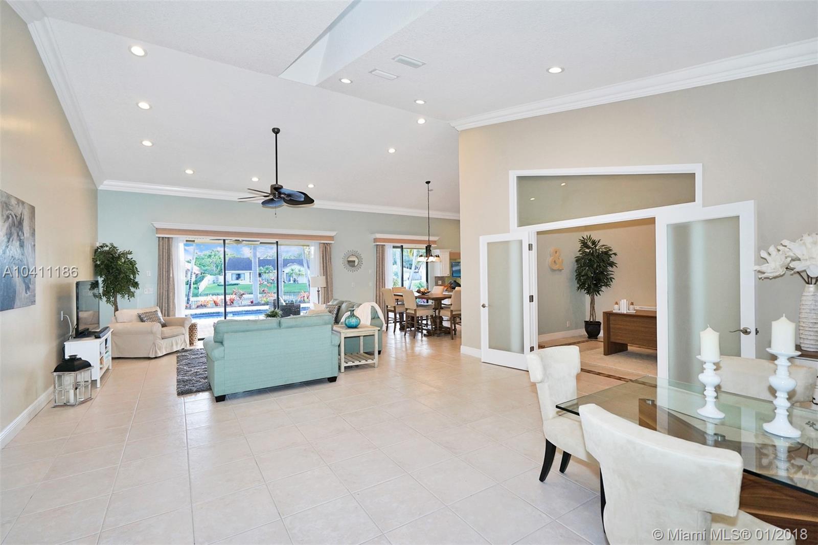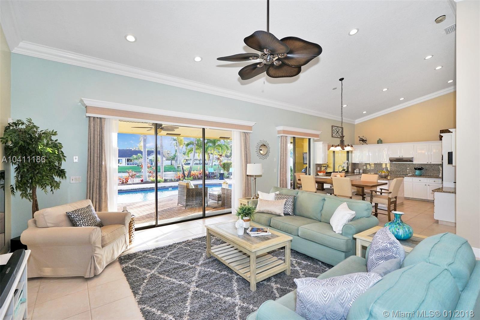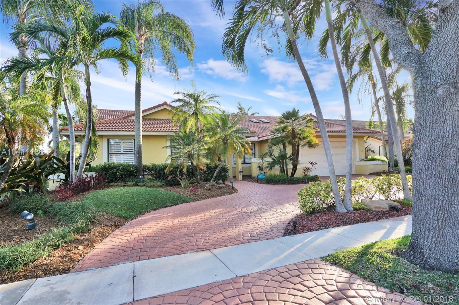 Without a doubt, the most beautiful home in Jacaranda Lakes in this price range! Gorgeous view! Great open floor plan! 4 bedrooms PLUS office. Perfect for backyard entertaining. Quiet street ends in a cul-de-sac. All white kitchen with 2015 stainless appliances, newer washer/dryer, laundry room with cabinetry. Stunning spare bathroom remodeled in 2015. Impact front double french doors & impact cabana doors in each bathroom. Shutters on all other windows. Roof replaced 2006. Pool resurfaced and color LED lights were installed in 2015. Extensive landscape lighting. LED high hat lighting in common area. Crown molding throughout. Large neutral tile throughout. Large baseboards. Knockdown ceiling installed in 2017. Large circular driveway. This home is a knockout! SHOWINGS START SATURDAY.