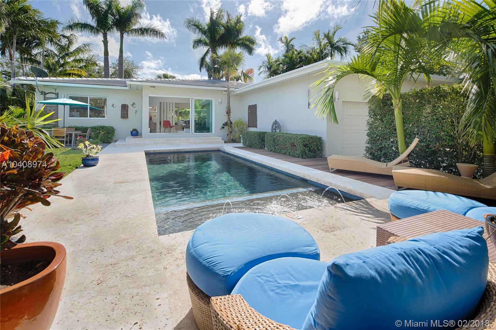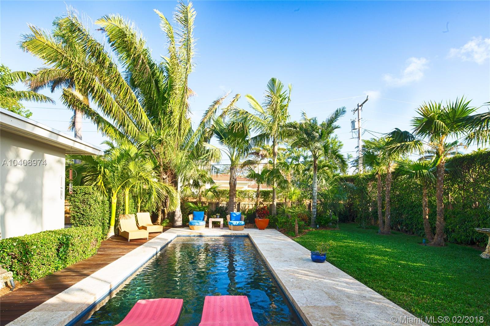 This Exquisitely updated Midcentury inspired home is just a block from Biscayne Bay, carefully modernized to achieve a new level of luxury living in Miami Shores. This 3 bedroom/2 bath home exudes tropical elegance with a botanical garden inspired landscape and Café Imperial limestone floors. Stunning views through large sliding doors transform the space into a true in/outdoor living experience. A boutique Hotel inspired saltwater/heated pool flanked by Philippine shell stone, and Ipe decking. Custom contemporary kitchen has generous white quartz island with top of the line Thermador stainless steel appliances. New roof with warranty, newer Trane AC with warranty, impact glass windows, hardwood flooring, Eco-R30 insulation, 2 car garage with rear entry access, FEMA certified property.