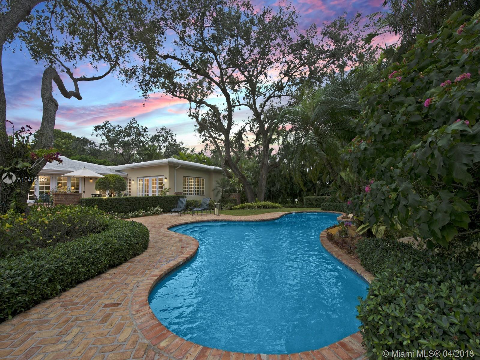 Enchanting! Understated elegance defines this deceptively spacious estate. Natural light and high ceilings greet you inside. Open kitchen- a chef's delight. Generous and bright bedrooms with superb closets, maids/in-law quarters. Separate Master Wing features a huge bonus room/office/study flanking the gorgeous master suite retreat. French doors provide gorgeous views from kitchen, Florida room and breakfast area. Vast private garden paved with Chicago brick invites you to the relaxing pool and entertaining area surrounded by lush greenery. Perched atop a full half acre, this is truly Coral Gables living!