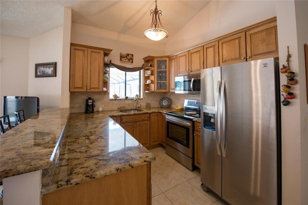 Beautiful starter home in a great school district. Newer (2014) kitchen cabinetry, granite tops & stainless steel appliances, (refrigerator brand new). Beautiful 18x18 porcelain tile throughout main living areas w/carpet in bedrooms, (2 bed new carpet), with completely updated 2nd bath. Enjoy outside living with oversized screened patio with pool & spa. For privacy you'll love the new shadow-box fencing. Many newer items that are included consist of 2017 central A/C, washer, garage door & outside painting