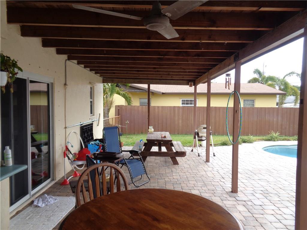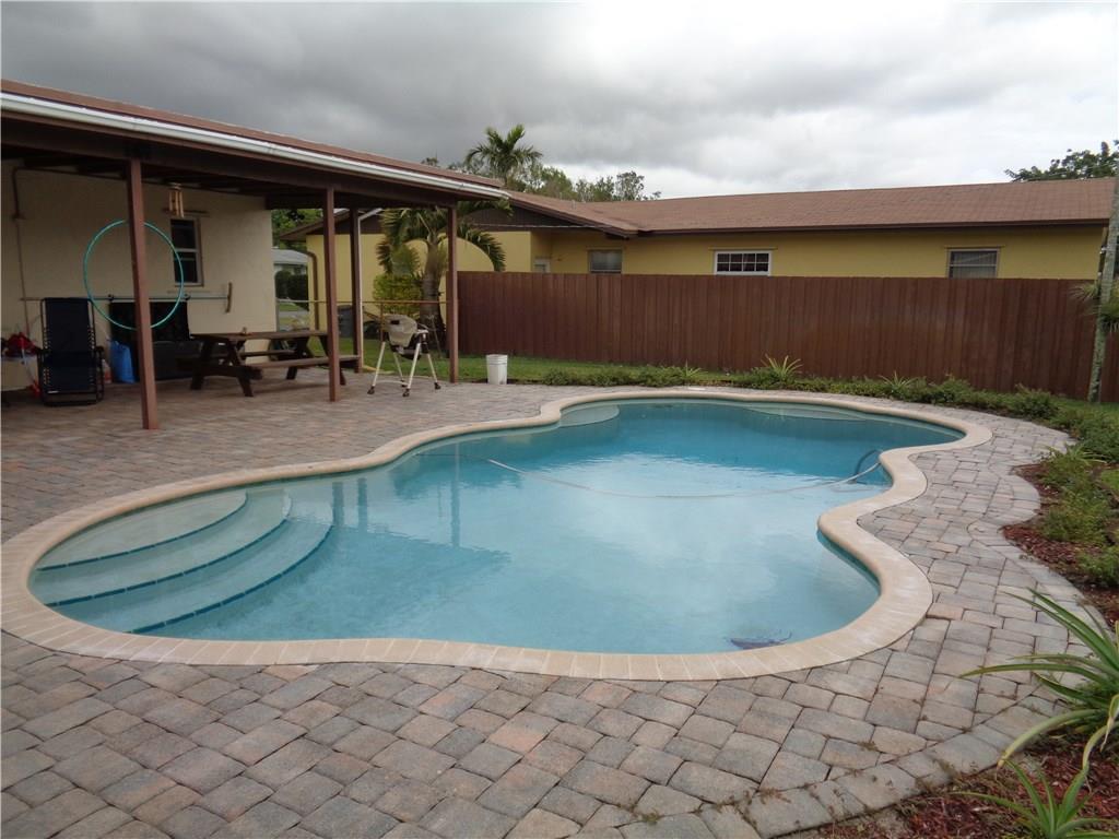 Plantation Park pool home. 3/2 split bedroom plan. Large living room, family room, dining room, eat in kitchen with built in breakfast area. Pass thru from kitchen to covered patio. Large yard with covered patio area and paver deck around sparkling pool. Walk to all level schools. Very convenient. Popular floor plan. Guest rooms close off from family room with a pocket door. Lots of space here. Tile & laminate floors throughout. Fenced yard. Quiet cul de sac street.