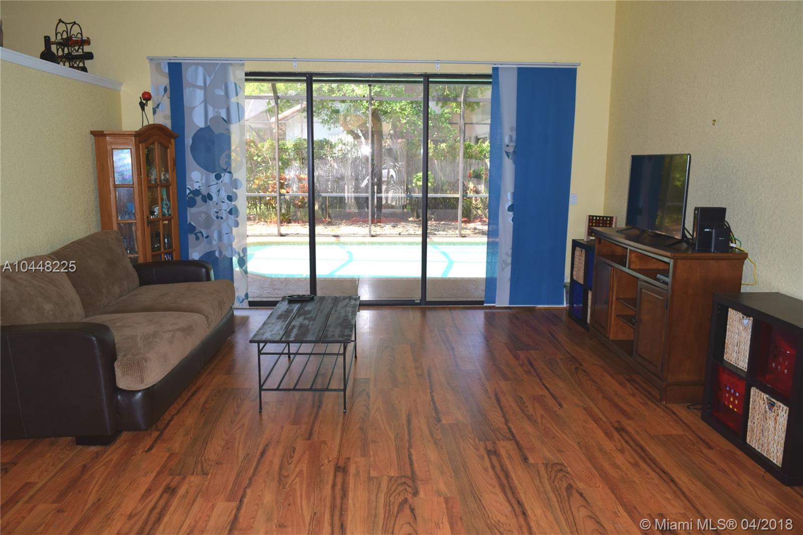 Gorgeous spacious home in popular neighborhood features triple split plan with high ceilings, Laminate wood flooring in all bedrooms and tile throughout. Eat-in-kitchen with granite countertops, stainless steel appliances, and center cooking island that overlooks the familyroom. Large living room with separate formal dining room. Master bedroom has double spacious closets, Master bathroom has Shower and Roman tub with dual vanities. Double door glass entryway, separate laundry room, hurricane shutters, screened in pool with large patio area situated on cul-de-sac. Property is listed under Appraised value for instant equity!
