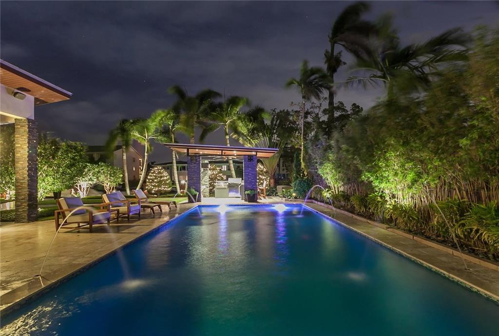 Welcome to paradise. Designed by award winning architect Kevin Akey in 2014, this custom built home sits on a 12,500 sq.ft. lot with 100 ft. on the water. The exterior is enhanced by stone, metal and a custom front door. The floors are porcelain throughout with hardwood in the bedrooms. The cabinets and built-ins were imported from Italy and the range, hot water heater, two fireplaces, summer kitchen and dryer are all gas. The ceilings are vaulted in every room. Garage A/C New dock on wide canal. House IT