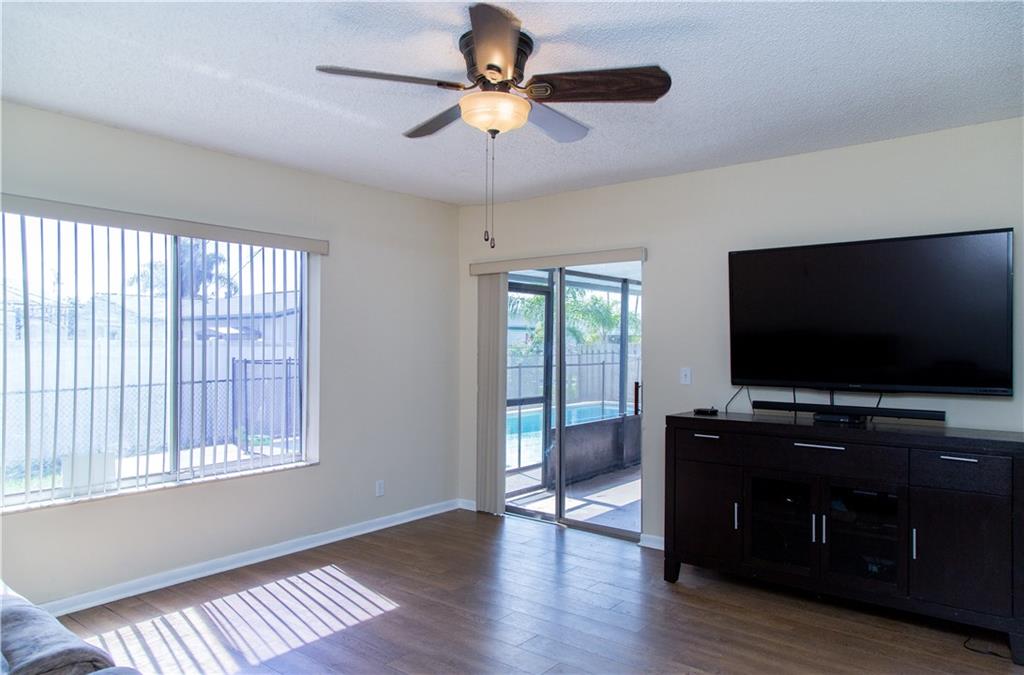 Clean, comfortable, updated kitchen, pool and a fenced yard make this 4/2 a great family home. There is a covered patio facing the pool and backyard and many new upgrades throughout the home, including ceiling fans and a fresh coat of paint. There is a one car attached garage plus enough room for 4 cars in the driveway. Location is another plus point as is the fact the home has 4 bedrooms plus a family room for entertainment. This home makes for easy living close to it all and is move-in ready. NO HOA