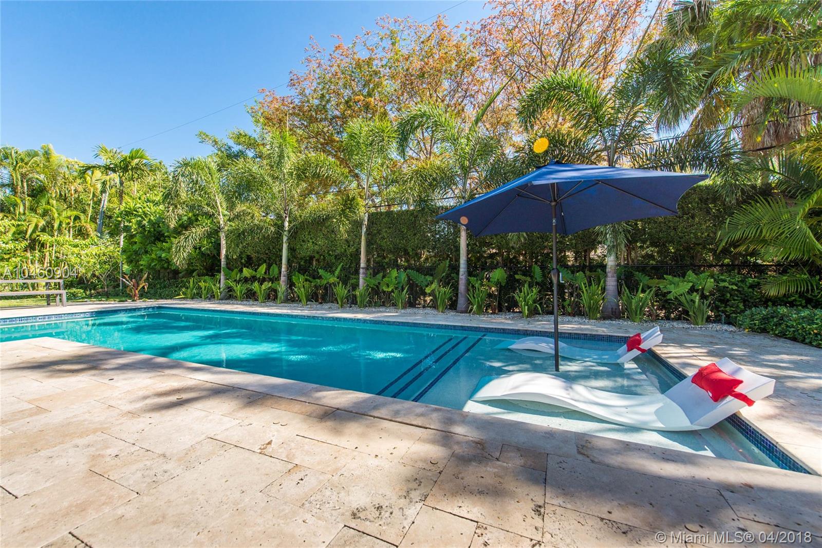 Classic mid-century home, on a quiet tree-lined street in coveted South Gables neighborhood. Updated & light-filled living spaces that feature vaulted, wood beamed ceilings, fireplace, terra-cotta flooring and impact glass throughout. 3BR/3BA plus den. Walls of glass overlook the lushly landscaped tropical garden ( 14,093 SF) which surrounds a spectacular new pool (heated) and limestone terrace. Custom kitchen with white wood cabinetry, granite countertops/backsplash and range with double-oven. Large master suite features marble bath with Jacuzzi tub & frameless glass-enclosed shower. Prime location in Sunset Elementary school district, is close to South Miami town center’s shopping, dining & entertainment and minutes to downtown Coral Gables, UM & Metrorail.