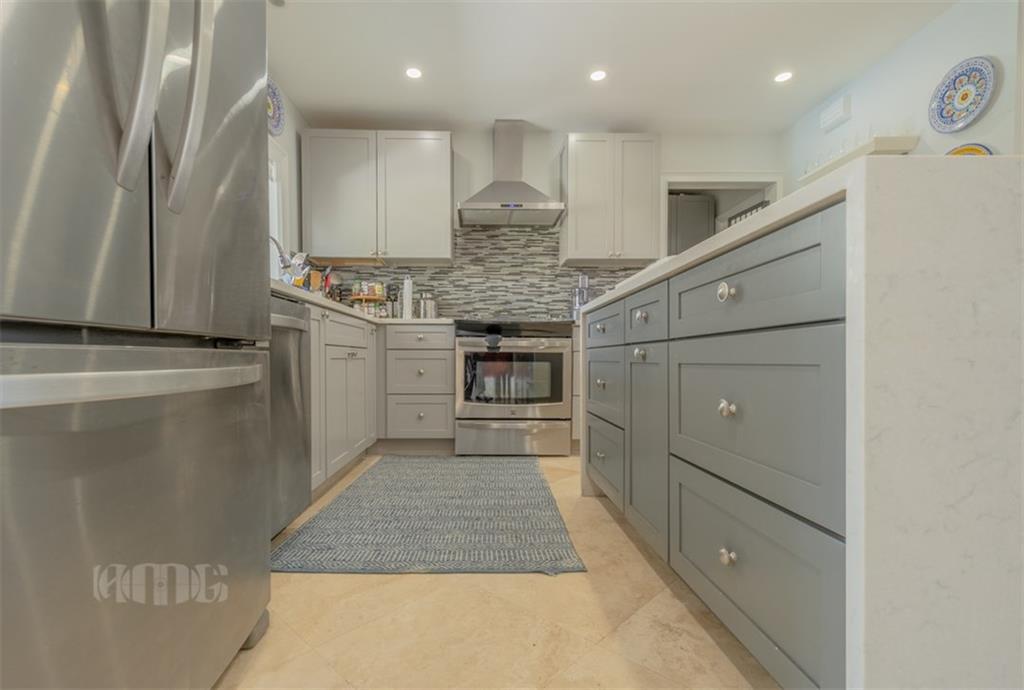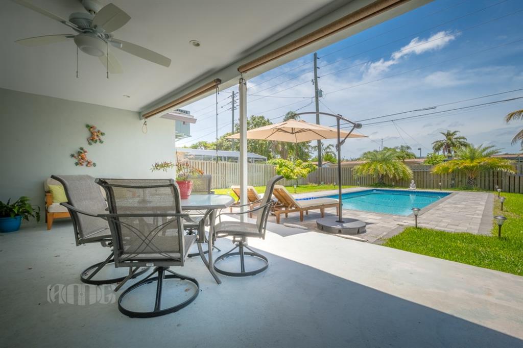 This 3/2 home has been BEAUTIFULLY remodeled with the best of everything! The Living/Dining/Kitchen "Great Room" is impeccable with glossy tile flooring & looks directly at the large pool & fenced yard. The open Kitchen has pale grey Shaker style cabinets, white quartz "waterfall" countertops & all stainless steel appliances. A marble tile backsplash, stainless range hood & island breakfast bar complete this Dream Kitchen. Impact doors/windows, garage, laundry & location make this your 'must have' home.