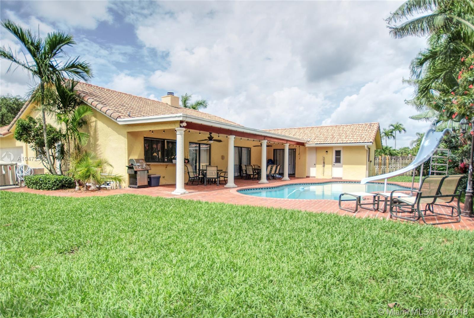 Highly sought after expanded Ambassador model located in Jacaranda Lakes. This one of a kind home features 4 bedrooms and 2 ½ bathrooms. Open concept with lots of room for entertaining or a cozy moment with a book by the double-sided fireplace. Dual zoned air conditioning. Roof replaced in 2007 with impact skylights. Huge fenced in backyard with lavish pool and lush landscaping. Kitchen features granite countertops and stainless steel appliances. Separate laundry with new LG washer/dryer. Property is situated on an enormous corner lot with plenty of green space. Jacaranda Lakes HOA fees are only $489/year. Too many upgrades to list on this perfect family home. All offers considered!