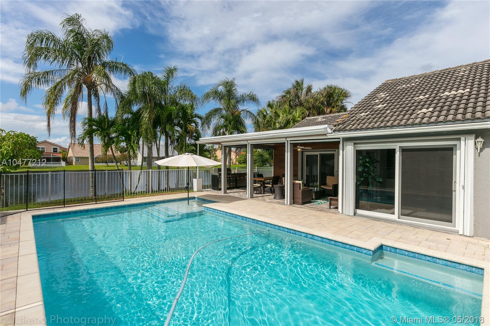 Gorgeous single family home at Boca Chase (Impressions) on a great cul-de-sac lot. Completely renovated home 3/2 with 2 car garage, waterproof laminate floors throughout, tastefully renovated bathrooms, open eat in kitchen with wood cabinets and granite counter top, stainless steel appliances, owner spent $35,000.00 on impact windows and hurricane shutters, patio customized with bamboo ceiling, retractable screen, bluetooth speakers, gigantic pool 30x16 with heater, outdoor shower, summer kitchen with marble top, sink and fridge, beautiful lake view, too many great features. Excellent location and great schools. READY TO MOVE IN!!! (furniture negotiable)