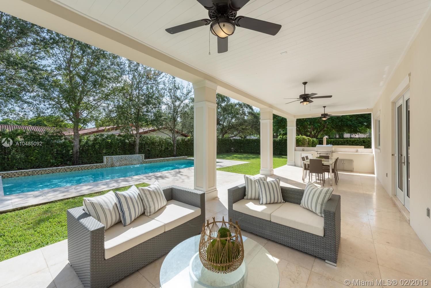 Stately 5 bedroom home w/ 5,000 SF of living area on 16,757 SF lot in sought-after North Pinecrest. Features formal living rm & dining rm, great room adjacent to kitchen, gas fireplace, wet bar & recessed lighting. Gourmet kitchen w/ granite countertops, wood cabinetry & top of the line SS appliances. Plenty of storage with butler’s pantry & walk-in pantry. Beautiful marble staircase leads to the master bedroom w/ separate dressing area, large walk-in closet & private terrace. Master bath has a separate tub and shower & two sinks. All bedrooms w/ ensuite baths & spacious closets. Two of the three bedrooms upstairs have private terrace. Pool, covered patio & summer kitchen for entertaining. 3-car gar, generator, high impact windows & doors. Downstairs bedroom w/walk in closet & cabana bath.
