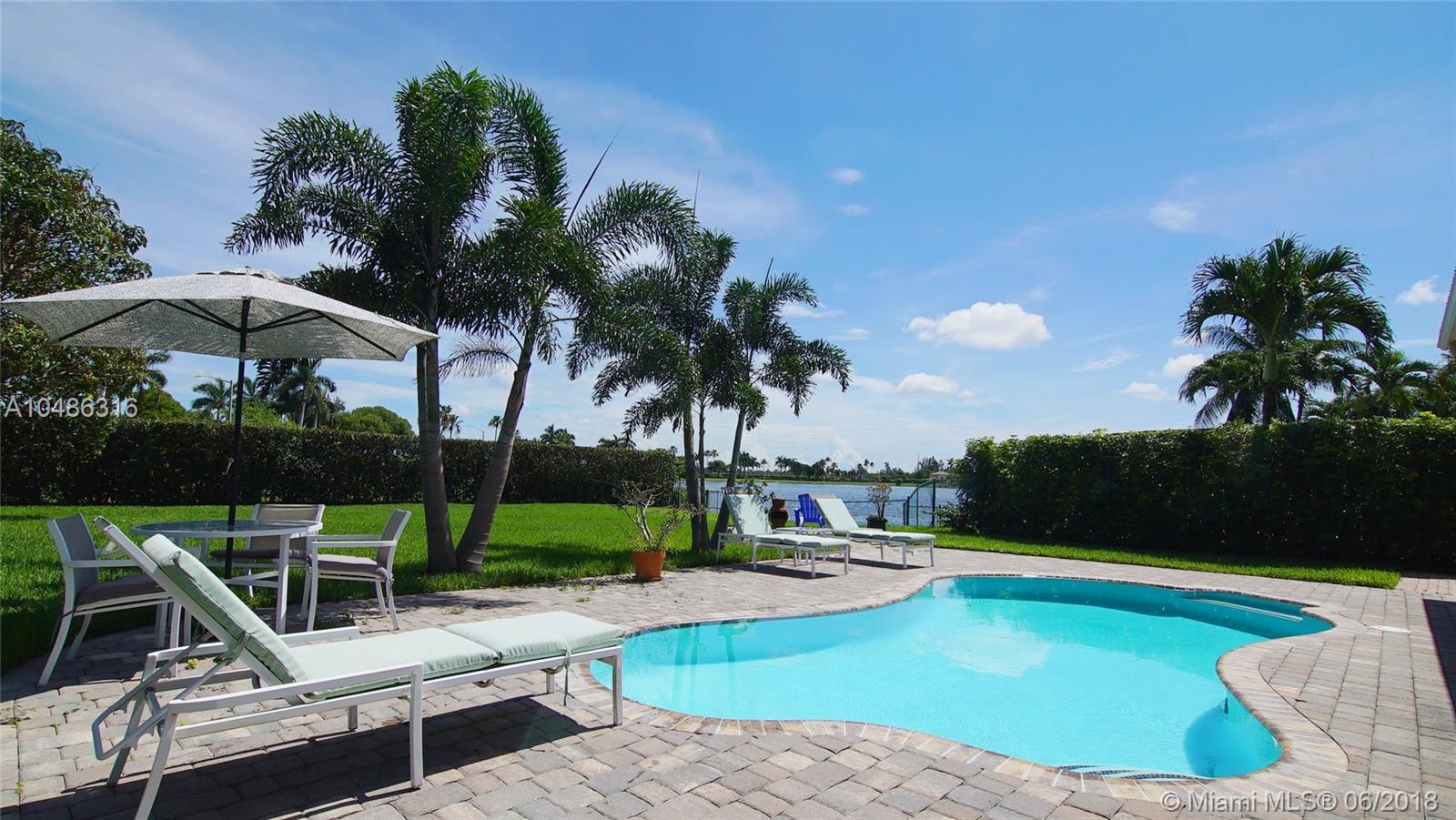 Beautiful one story home on one of the largest lots in Monarch Lakes, waterfront & no rear neighbor, mango tree out back! Salt water capable Pool; large paved patio with pavers extending out towards lake, pavers extend on the east side to the front of the home; solar water heater; A.C. 2 years new; 3 bedroom split floor plan. Master has bamboo floors, walk in closet with built ins, dual vanity, tub and separate shower. Guest rooms w/engineered wood; tile through out main areas. Master bedroom and kitchen area open up to the pool with French doors. High ceilings. Separate laundry room! Located in a cul-de-sac. Lots of light! Gated community. Walking distance to elementary school, shopping and restaurants, yet tucked away in a quiet gated subdivision! (water frontage unk)